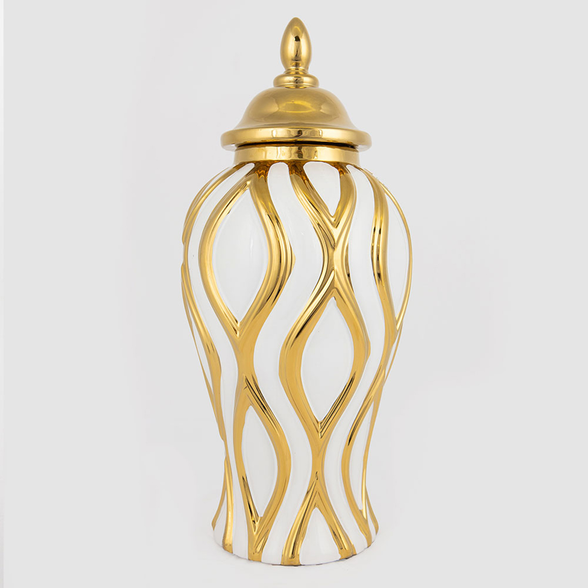 Διακοσμητικό δοχείο με καπάκι της εταιρείας Estheti σε λευκό-χρυσό χρώμα με μοντέρνο σχέδιο. Είναι κατασκευασμένο από κεραμικό υλικό. Τοποθετήστε το στο σαλόνι ή την τραπεζαρία και ταιριάξτε το με άλλα είδη διακόσμησης απ' το Spitishop για να φτιάξετε το σπίτι που πάντα ονειρευόσασταν.