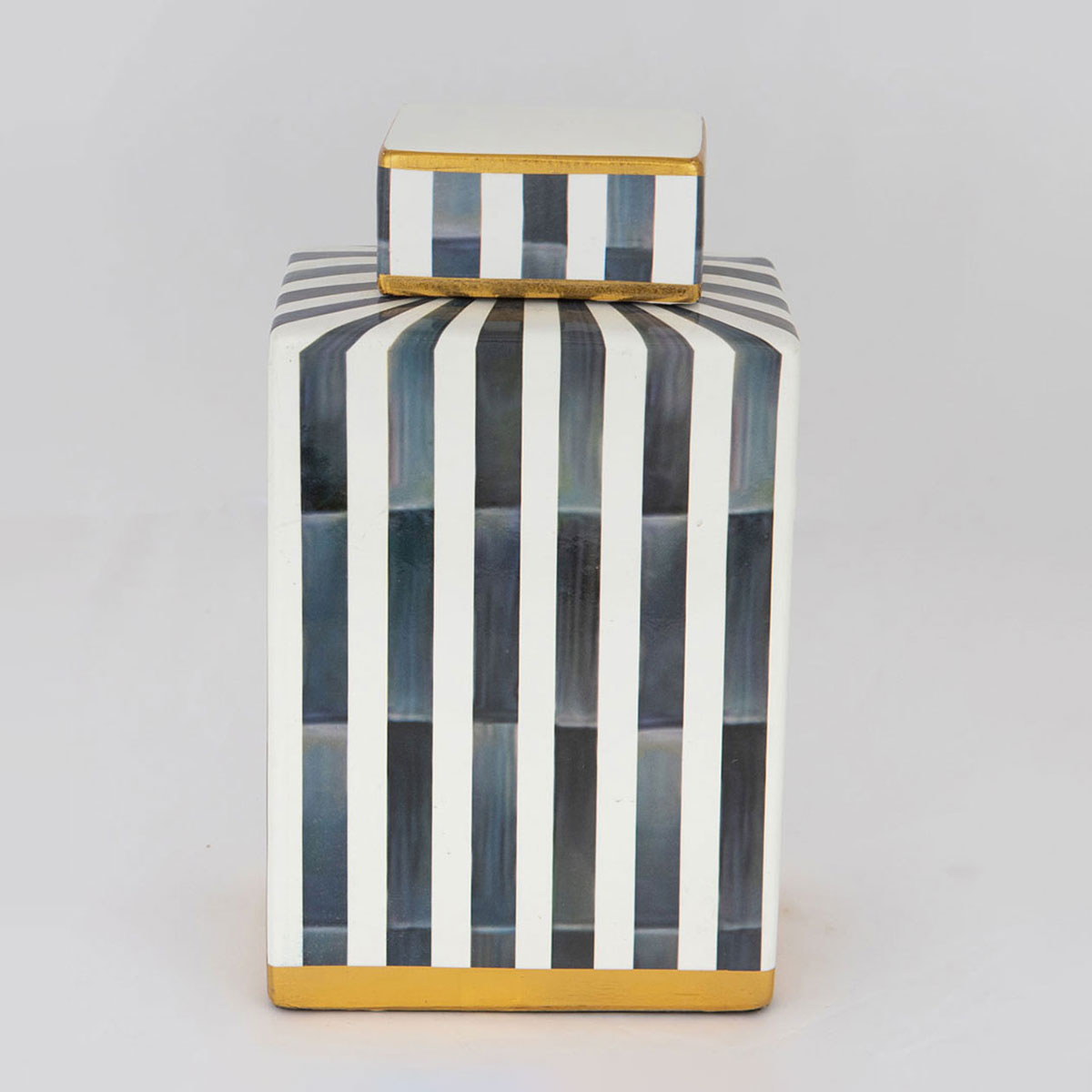 Διακοσμητικό δοχείο με καπάκι της εταιρείας Estheti σε λευκό-μπλε χρώμα με χρυσές λεπτομέρειες και μοντέρνο σχέδιο. Είναι κατασκευασμένο από κεραμικό υλικό. Τοποθετήστε το στο σαλόνι ή την τραπεζαρία και ταιριάξτε το με άλλα είδη διακόσμησης απ' το Spitishop για να φτιάξετε το σπίτι που πάντα ονειρευόσασταν.