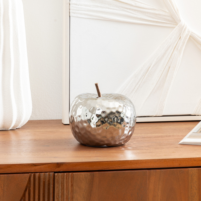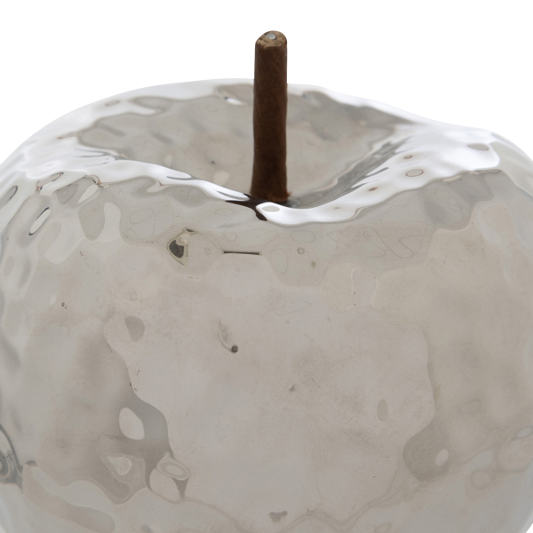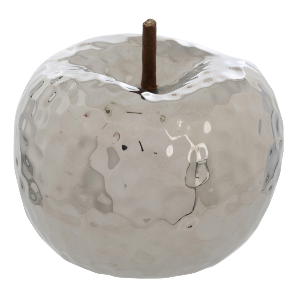 Επιτραπέζιο διακοσμητικό σε σχήμα μήλου, που θα χαρίσει μοναδικό ύφος στον χώρο σας. Είναι κατασκευασμένο από κεραμικό υλικό σε ασημί χρώμα. Ιδανικό για να τοποθετηθεί στο τραπεζάκι του σαλονιού, τον μπουφέ, το γραφείο και όπου αλλού ταιριάζει. Συνδυάστε το με τα υπόλοιπα προϊόντα της ίδιας σειράς για ένα ολοκληρωμένο αποτέλεσμα στο χώρο σας.