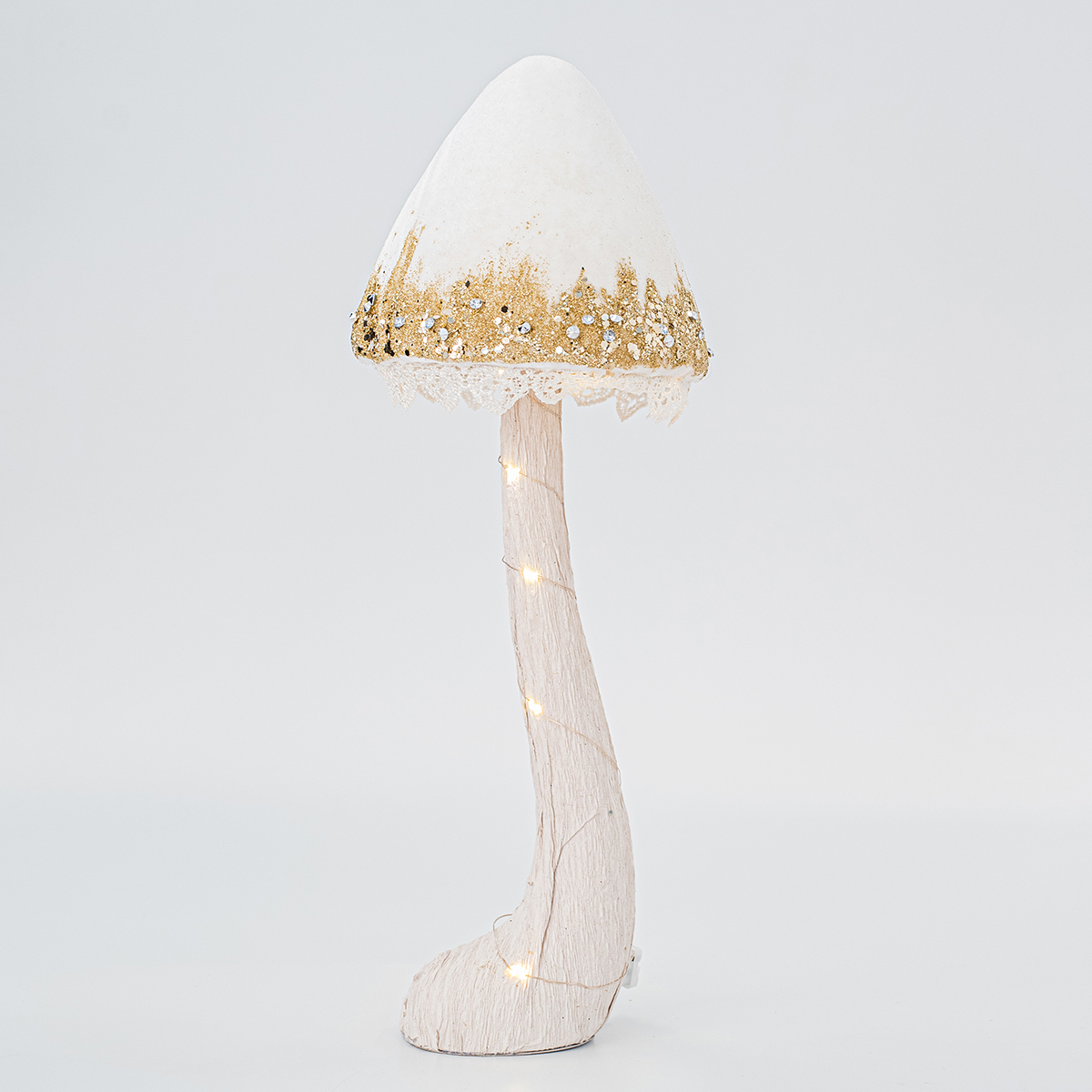 Επιτραπέζιο διακοσμητικό σε σχήμα μανιταριού με φωτάκια Led της εταιρείας Eurolamp. Το εξωτερικό ύφασμα είναι λευκό βελούδο με χρυσό γκλίτερ ενώ εσωτερικά διαθέτει φελιζόλ. Eίναι ιδανικό για να στολίσει όποιο χώρο του σπιτιού επιθυμείτε. Συνδυάστε το με τα υπόλοιπα είδη της ίδιας συλλογής για ένα ολοκληρωμένο αποτέλεσμα στο χώρο σας