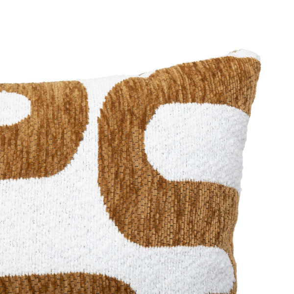 Διακοσμητικό μαξιλάρι 2 όψεων με μοντέρνο σχέδιο. Η μια πλευρά είναι μονόχρωμη καφέ, ενώ η άλλη είναι λευκή με σχέδιο στο χρώμα της ώχρας. Το εξωτερικό ύφασμα είναι chenille από 100% polyester που το καθιστά ιδιαίτερα μαλακό και ζεστό, ενώ η γέμιση είναι πολυεστερική βάτα. Διαθέτει φερμουάρ για να αφαιρείται η γέμιση και να πλένεται. Ιδανικό για τους χειμερινούς μήνες του χρόνου.
