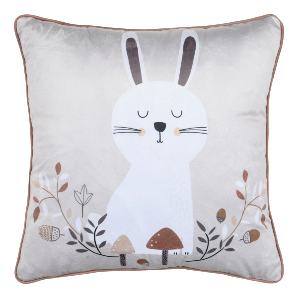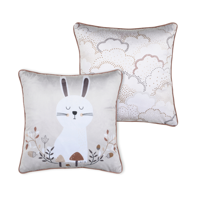 Διακοσμητικό μαξιλάρι για το βρεφικό ή το παιδικό δωμάτιο. Η μία πλευρά έχει σχέδιο λαγουδάκι σε γκρι-μπεζ αποχρώσεις ενώ η άλλη έχει μοντέρνο σχέδιο σε εκρού-μπεζ-γκρι χρώμα. Το ύφασμα της μαξιλαροθήκης έχει σύνθεση από 100% polyester και έχει γέμιση από πολυεστερική βάτα. Συνδυάστε το με τα υπόλοιπα είδη της σειράς για ένα ολοκληρωμένο αποτέλεσμα.