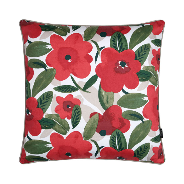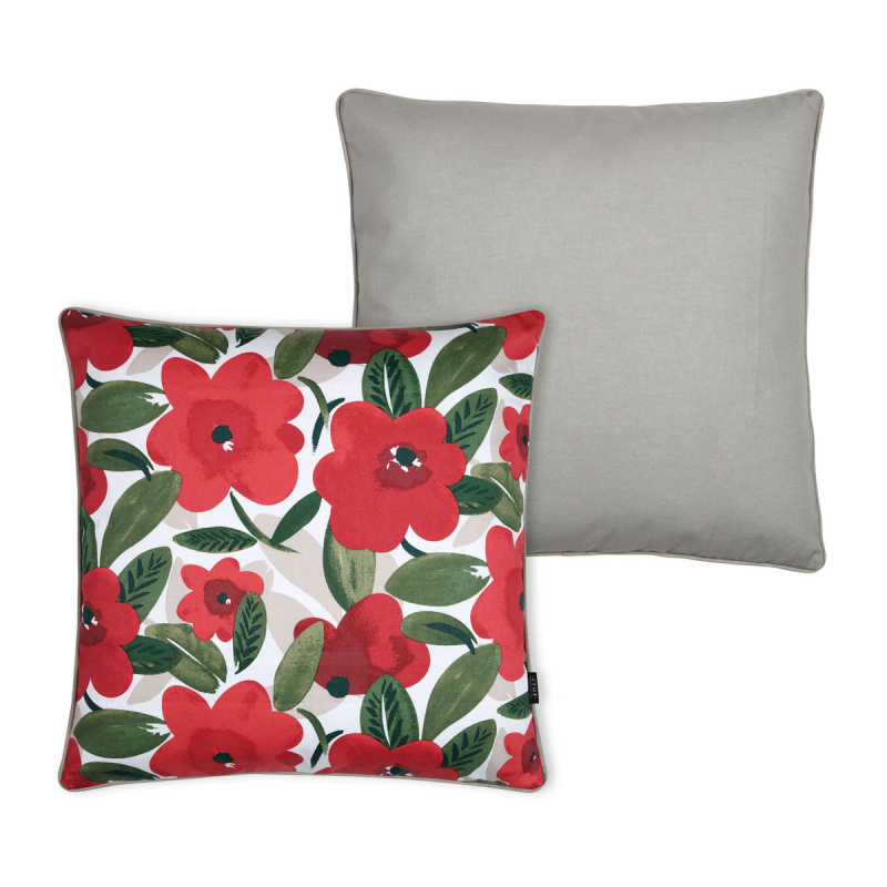 Διακοσμητικό μαξιλάρι με την μία πλευρά να έχει φλοράλ σχέδιο σε κόκκινο-πράσινο χρώμα και γκρι-εκρού λεπτομέρειες ενώ η άλλη είναι μονόχρωμη σε γκρι-μπεζ χρώμα. Το εξωτερικό ύφασμα είναι από 100% βαμβάκι ενώ το εσωτερικό γέμισμα πολυεστερική βάτα. Διαθέτει φερμουάρ για να αφαιρείται η γέμιση και να πλένεται. Ιδανικό για να ολοκληρώσει την διακόσμηση στο σαλόνι, την κρεβατοκάμαρα ή οποιοδήποτε άλλο σημείο του σπιτιού σας.