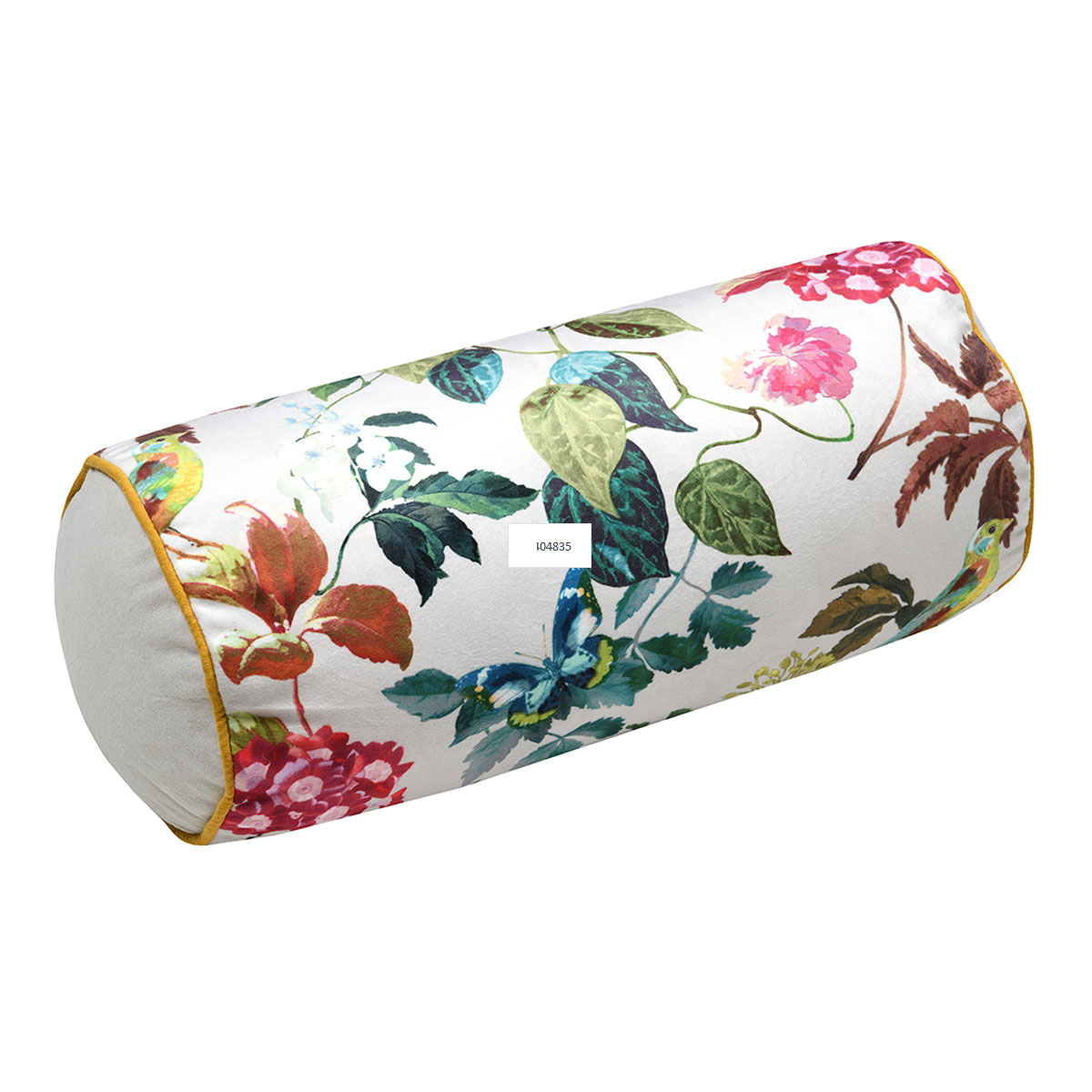 Διακοσμητικό μαξιλάρι κυλινδρικό σε λευκό φόντο, με πολύχρωμες λεπτομέρειες και φλοράλ σχέδιο. Το εξωτερικό ύφασμα είναι από 26% βαμβάκι 74% polyester, ενώ η γέμιση είναι πολυεστερική βάτα. Ανανεώστε εύκολα τον χώρο του σπιτιού σας, δίνοντας μια φρέσκια και ανάλαφρη διάθεση.