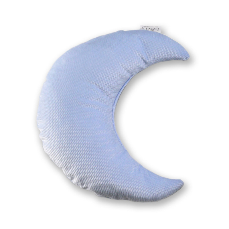 Διακοσμητικό μαξιλάρι σε γαλάζιο χρώμα και σχήμα μισοφέγγαρο για βρεφικό δωμάτιο από την εταιρεία Baby Oliver. Το βελουτέ ζακάρ ύφασμα είναι 100% polyester, που το καθιστά πολύ απαλό ενώ η γέμιση είναι από σιλικονούχο πολυεστέρα. Ιδανικό για αγοράκια. Ελληνικής ραφής.