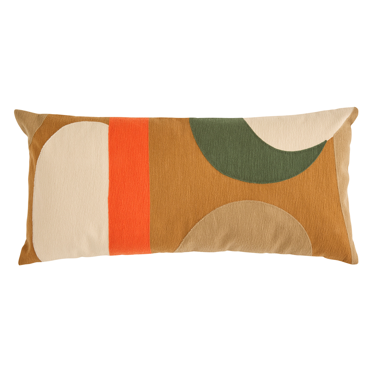 Μακρόστενο διακοσμητικό μαξιλάρι 30x50 με μοντέρνο σχέδιο. Το εξωτερικό ύφασμά είναι από polyester και βαμβάκι σε καφέ χρώμα με πράσινο, ιβουάρ και κοραλί κεντητό σχέδιο, ενώ η γέμιση είναι από πολυεστερική βάτα. Διαθέτει φερμουάρ για να αφαιρείται η γέμιση και να πλένεται. Ανανεώστε την κρεβατοκάμαρα, το σαλόνι, το γραφείο, και όποιον άλλο χώρο επιθυμείτε εύκολα, γρήγορα και οικονομικά με ένα διακοσμητικό μαξιλάρι. Συνδυάστε το με τα υπόλοιπα προϊόντα της ίδιας σειράς για ένα ολοκληρωμένο αποτέλεσμα στο χώρο σας.