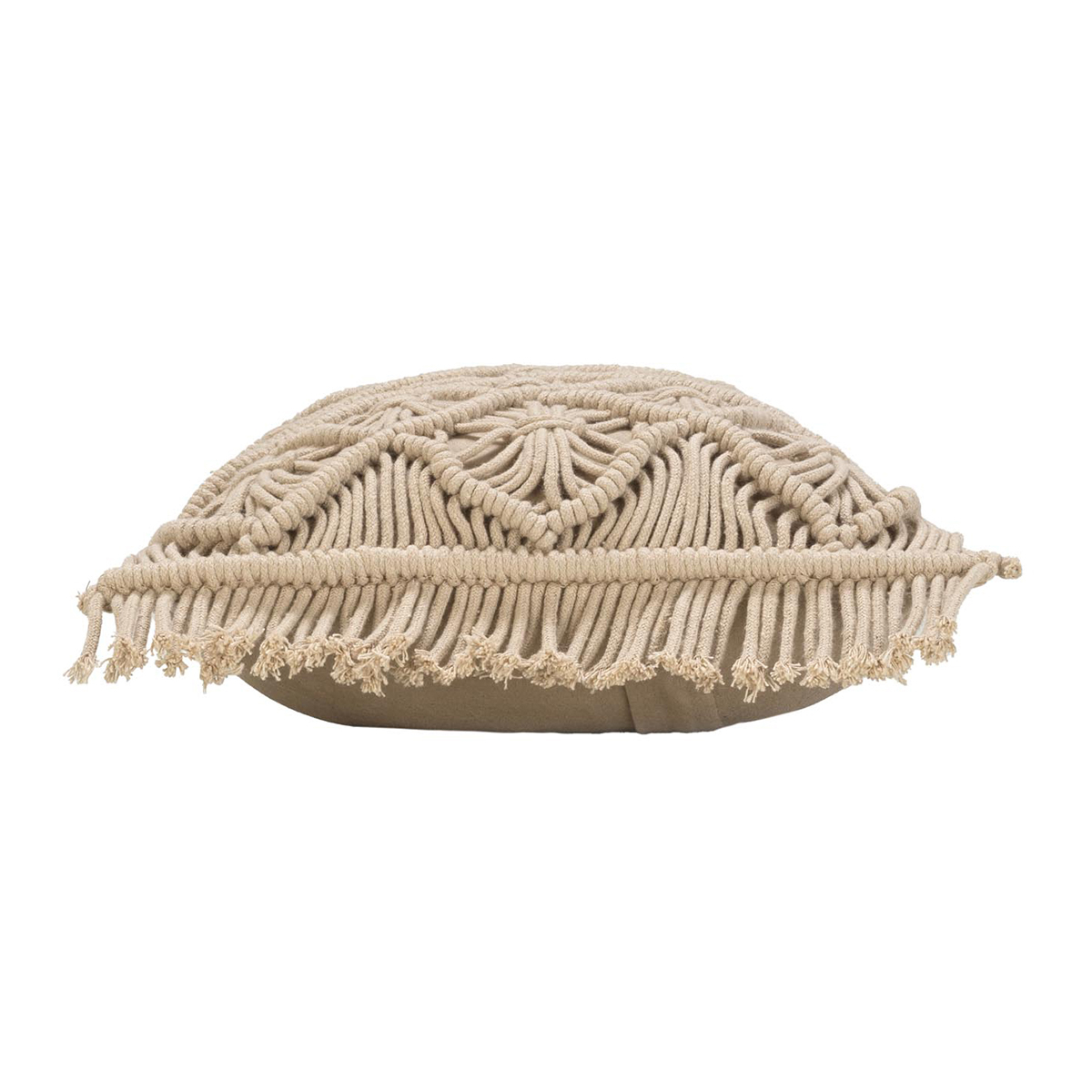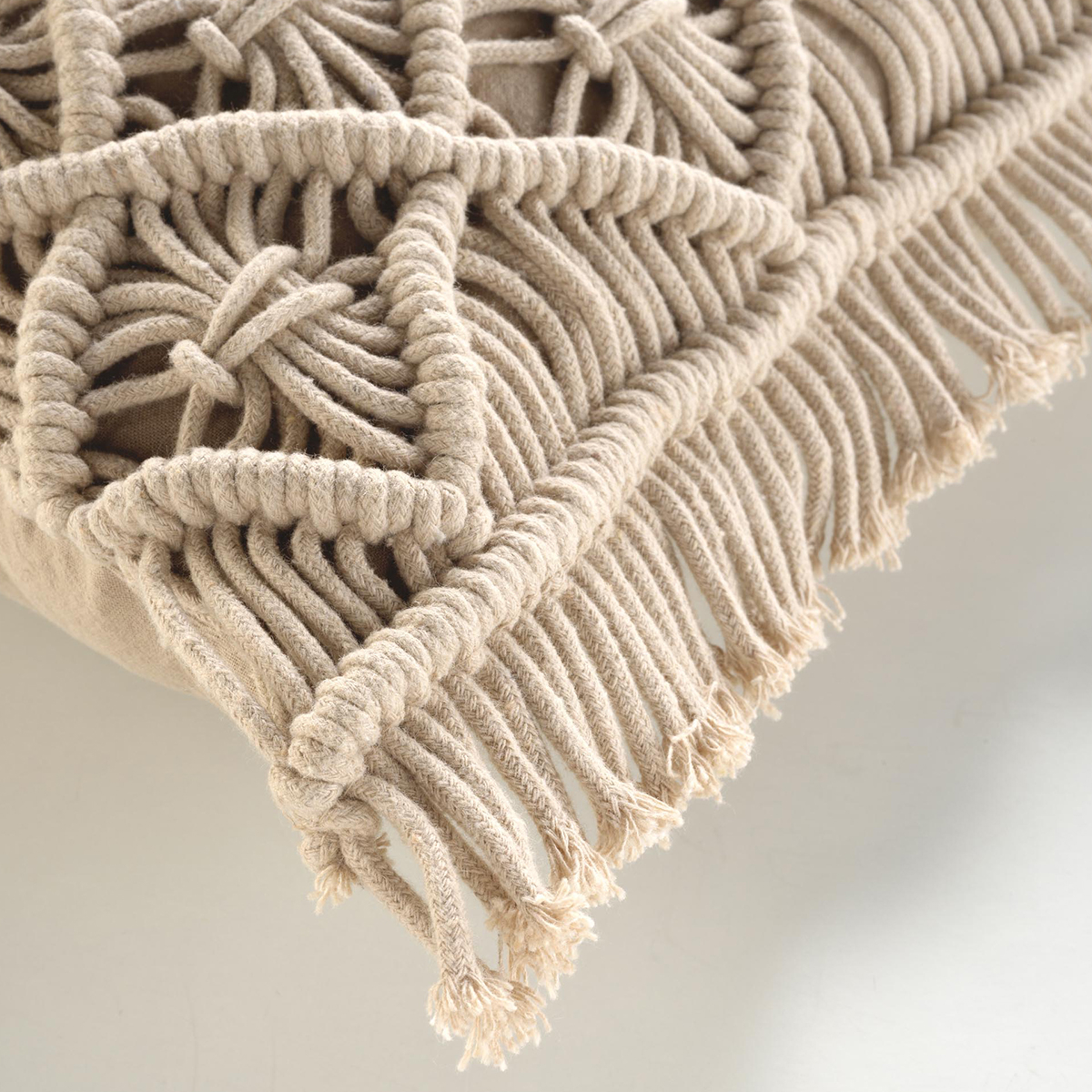 Διακοσμητικό μαξιλάρι σε ιβουάρ χρώμα με ανάγλυφο μακραμέ σχέδιο και boho αισθητική. Η σύνθεση της μαξιλαροθήκης είναι από 100% βαμβάκι, ενώ η γέμιση από πολυεστερική βάτα. Διαθέτει φερμουάρ για να αφαιρείται η γέμιση και να πλένεται. Συνδυάστε το με τα υπόλοιπα είδη της συλλογής για ένα ολοκληρωμένο αποτέλεσμα.