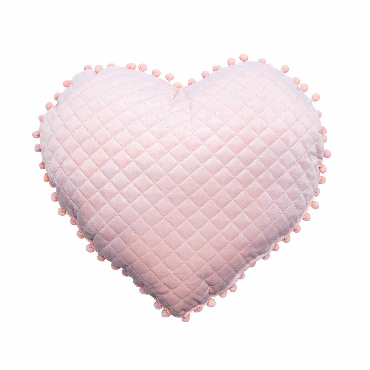 Βελουτέ διακοσμητικό μαξιλάρι σε ροζ χρώμα και σχήμα καρδιά από την εταιρεία Palamaiki. Το εξωτερικό ύφασμα είναι καπιτονέ με σύνθεση 100% Microfiber Velvet Feel και περιμετρικά πον-πον. Η γέμιση δεν αφαιρείται.