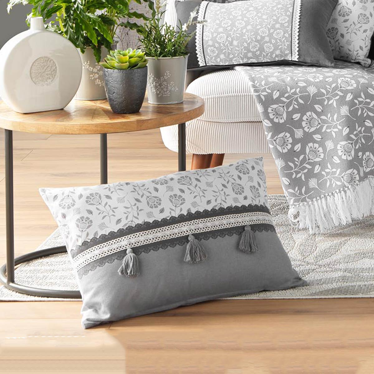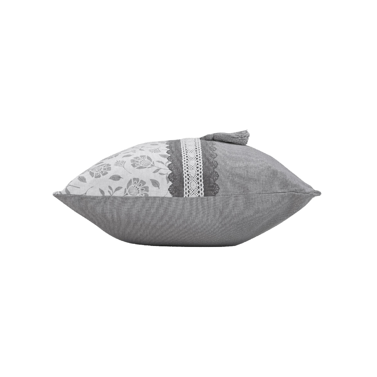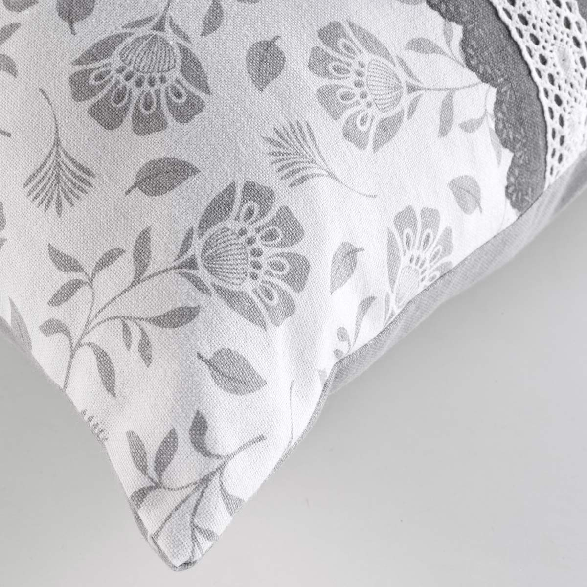 Διακοσμητικό μαξιλάρι σε γκρι και λευκό χρώμα με δαντέλα και φλοράλ σχέδιο. Διαθέτει διακοσμητικά φουντάκια σε γκρι χρώμα. Το ύφασμα της μαξιλαροθήκης είναι κατασκευασμένο από 58% Βαμβάκι-42% Polyester, ενώ η γέμιση από πολυεστερική βάτα. Διαθέτει φερμουάρ για να αφαιρείται η γέμιση και να πλένεται. Συνδυάστε το με τα υπόλοιπα είδη της συλλογής για ένα ολοκληρωμένο αποτέλεσμα.