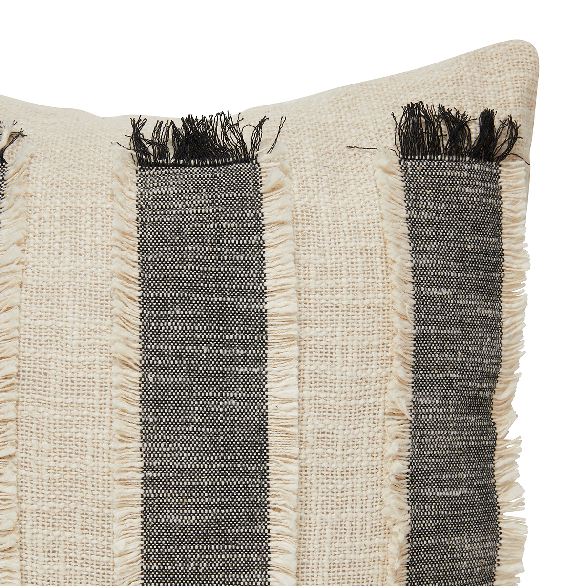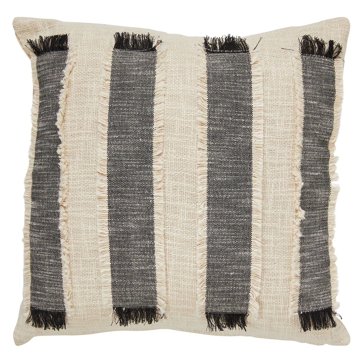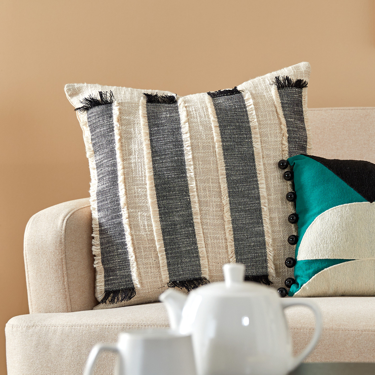 Τετράγωνο διακοσμητικό μαξιλάρι 50x50 με μοντέρνο σχέδιο. Το εξωτερικό ύφασμά είναι από polyester και βαμβάκι σε εκρού χρώμα με μαύρες λεπτομέρειες και όψη λινού, ενώ η γέμιση είναι από πολυεστερική βάτα. Διαθέτει φερμουάρ για να αφαιρείται η γέμιση και να πλένεται. Ανανεώστε την κρεβατοκάμαρα, το σαλόνι, το γραφείο, και όποιον άλλο χώρο επιθυμείτε εύκολα, γρήγορα και οικονομικά με ένα διακοσμητικό μαξιλάρι. Συνδυάστε το με τα υπόλοιπα προϊόντα της ίδιας σειράς για ένα ολοκληρωμένο αποτέλεσμα στο χώρο σας.