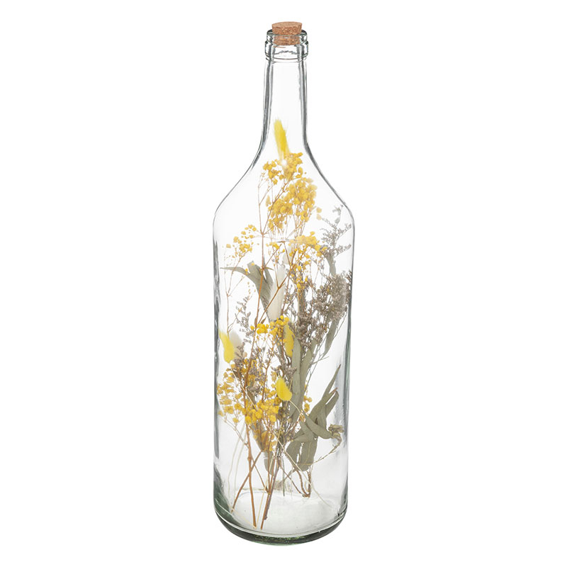 Μπουκάλι διακόσμησης με κίτρινα αποξηραμένα λουλούδια. Είναι κατασκευασμένο από διάφανο γυαλί και έχει πώμα από φελλό. Ιδανικό για το σαλόνι, την τραπεζαρία ή οποιονδήποτε άλλο χώρο επιθυμείτε να διακοσμήσετε και να δώσετε στυλ.