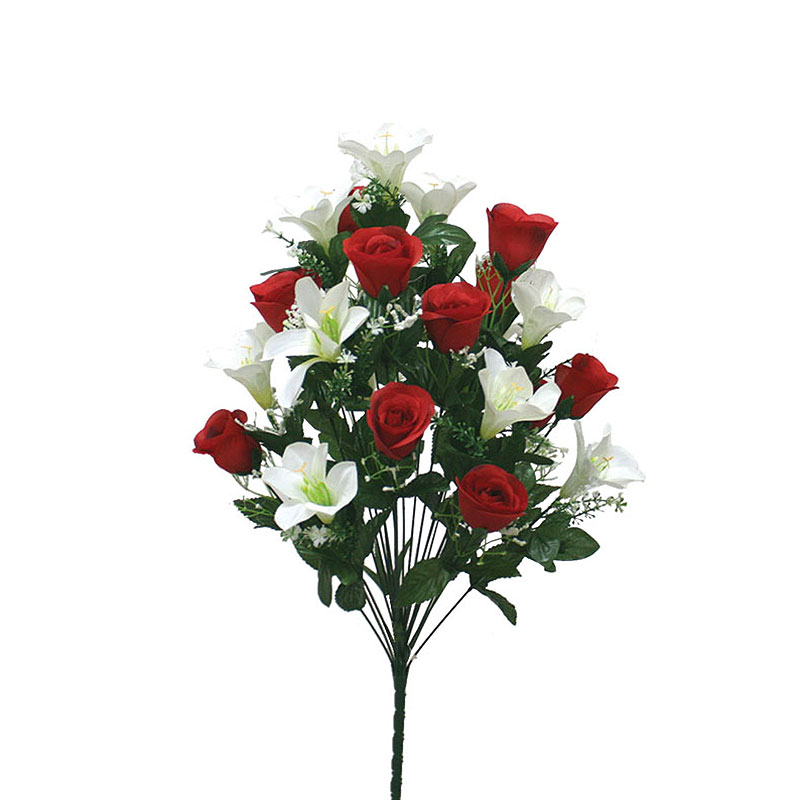 Τεχνητό μπουκέτο λουλουδιών της εταιρείας Marhome με κρίνους και τριαντάφυλλα σε λευκό και κόκκινο χρώμα. Είναι κατασκευασμένο από ύφασμα και πλαστικό υλικό, με μεταλλικό σύρμα στο εσωτερικό του για να μπορείτε να του δώσετε το σχήμα που επιθυμείτε. Χρησιμοποιήστε τεχνητά φυτά για να διακοσμήσετε τους εσωτερικούς ή εξωτερικούς χώρους σας και να ανανεώσετε την αισθητική τους!
