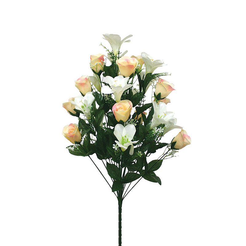 Τεχνητό μπουκέτο λουλουδιών της εταιρείας Marhome με κρίνους και τριαντάφυλλα σε λευκό και σομόν χρώμα. Είναι κατασκευασμένο από ύφασμα και πλαστικό υλικό, με μεταλλικό σύρμα στο εσωτερικό του για να μπορείτε να του δώσετε το σχήμα που επιθυμείτε. Χρησιμοποιήστε τεχνητά φυτά για να διακοσμήσετε τους εσωτερικούς ή εξωτερικούς χώρους σας και να ανανεώσετε την αισθητική τους!