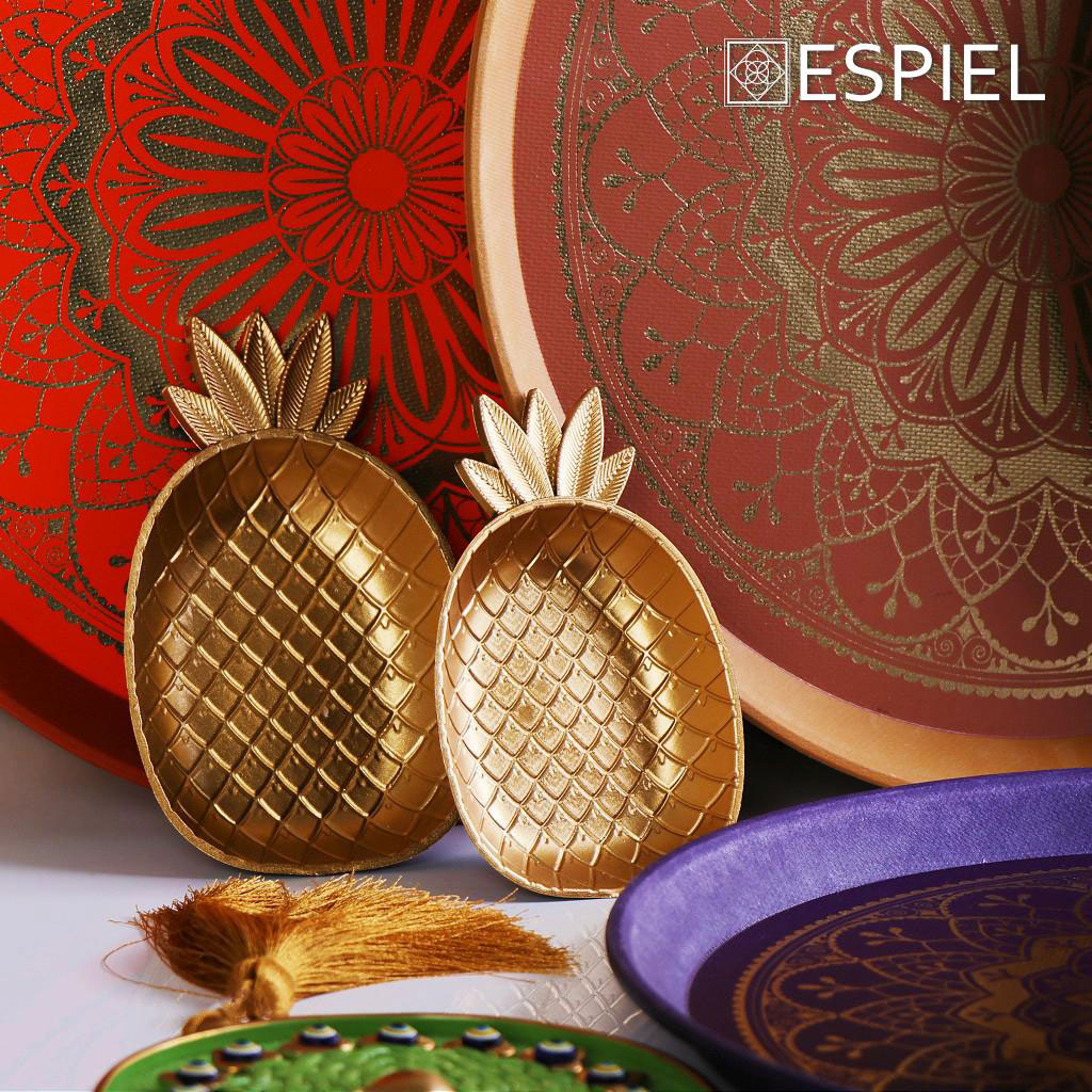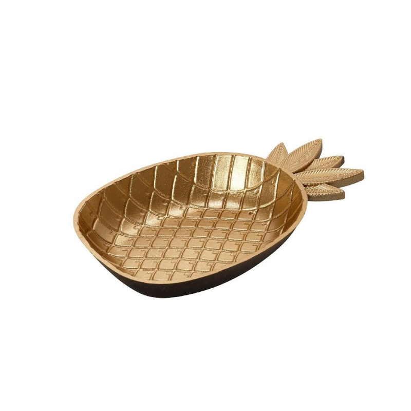 Διακοσμητικά μπωλ από την εταιρεία Espiel σε χρυσό χρώμα και σχήμα ανανά. Είναι κατασκευασμένα από πολυπροπυλένιο. Τοποθετήστε τα στην τραπεζαρία ή στο τραπεζάκι του σαλονιού σας και κλέψτε τις εντυπώσεις των καλεσμένων σας. Συνδυάστε τα με τα υπόλοιπα είδη της ίδιας σειράς για ένα ολοκληρωμένο σετ.