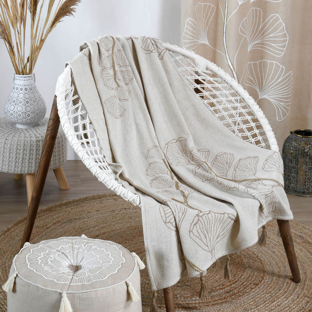Διακοσμητικό ριχτάρι με φλοράλ σχέδιο σε εκρού-μπεζ χρώμα και διακοσμητικές φουντίτσες στις γωνίες. Είναι κατασκευασμένο από 55% βαμβάκι-45% polyester. Μπορείτε να το τοποθετήσετε σε μία πολυθρόνα για να την καλύψετε ολόκληρη ή σε έναν μεγαλύτερο καναπέ σαν διακοσμητικό ριχτάρι. Συνδυάστε το με τα υπόλοιπα προϊόντα του ίδιου σχεδίου για ένα ολοκληρωμένο αποτέλεσμα.