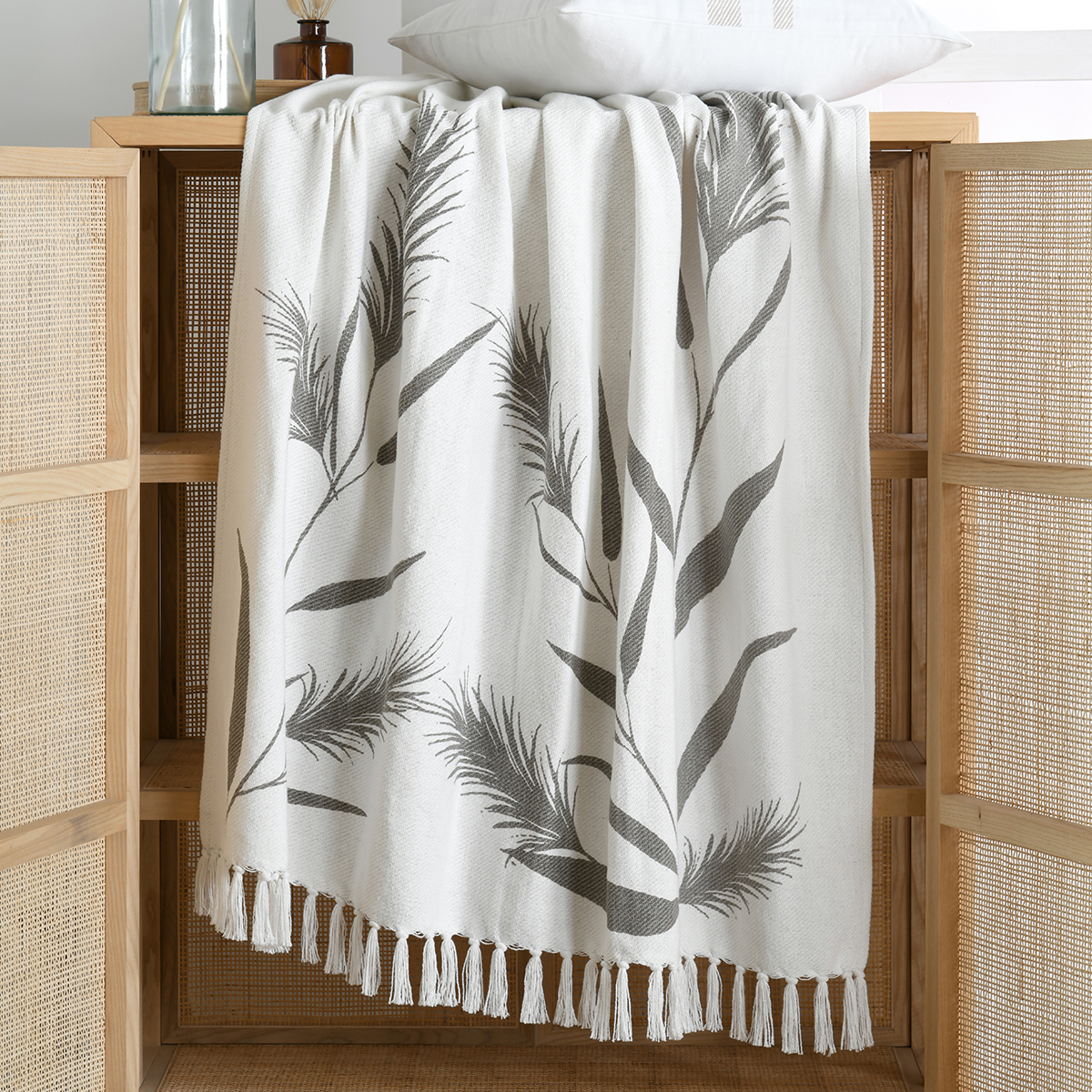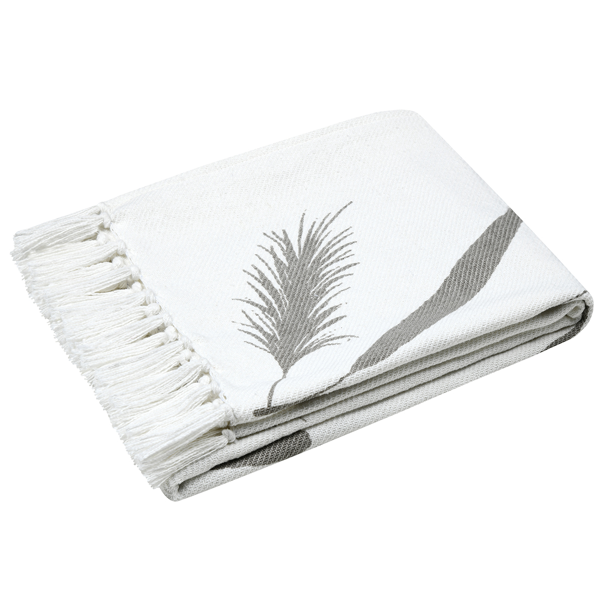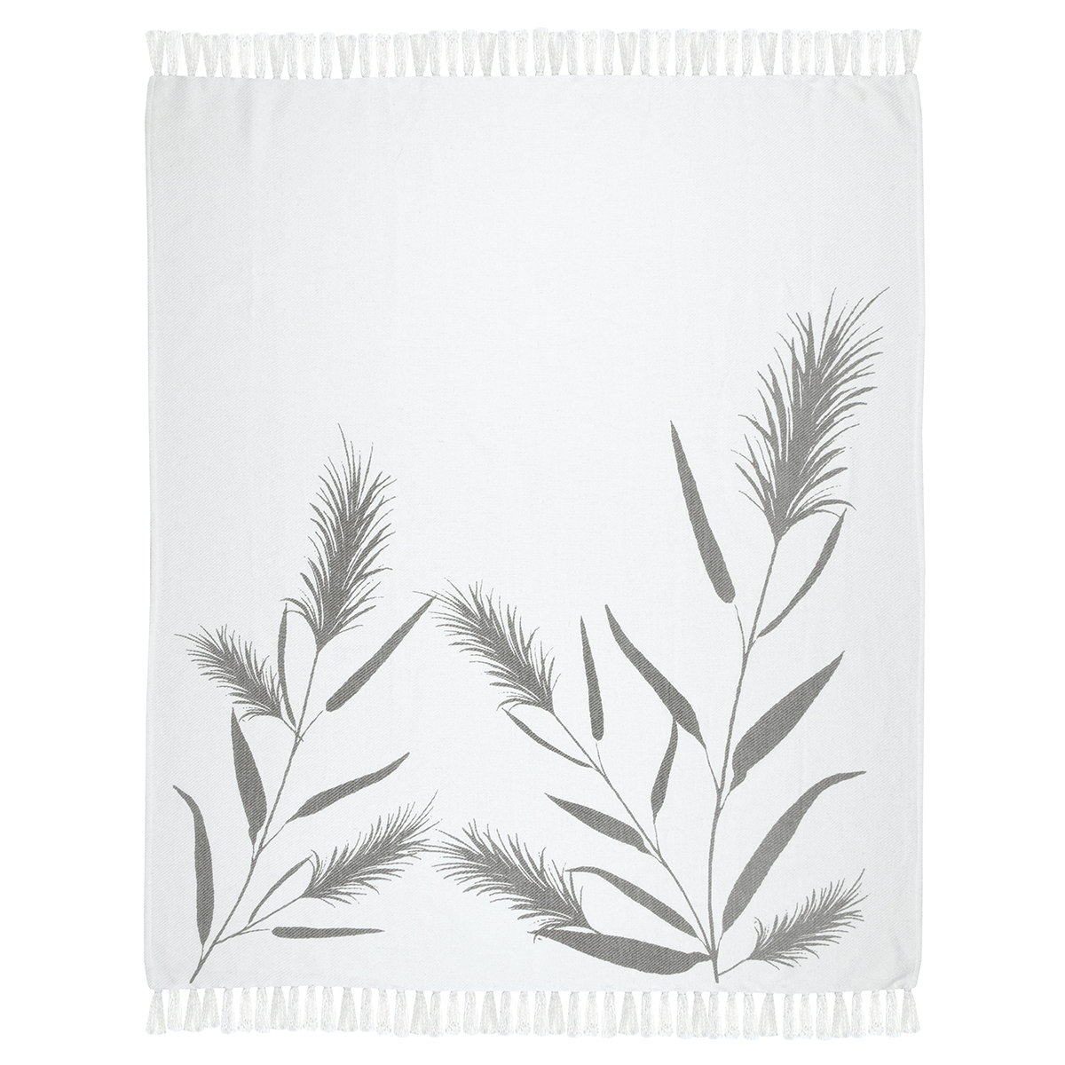 Διακοσμητικό ριχτάρι σε λευκό χρώμα με γκρι σχέδιο pampas. Είναι κατασκευασμένο από 55% βαμβάκι-45% polyester και έχει κρόσια στο τελείωμα. Μπορείτε να το τοποθετήσετε σε μία πολυθρόνα για να την καλύψετε ολόκληρη ή σε έναν μεγαλύτερο καναπέ σαν διακοσμητικό ριχτάρι. Συνδυάστε το με τα υπόλοιπα προϊόντα του ίδιου σχεδίου για ένα ολοκληρωμένο αποτέλεσμα.