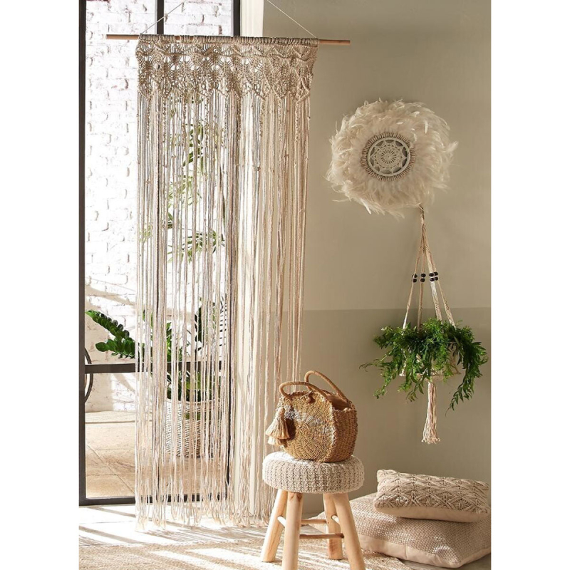Κρεμαστό διακοσμητικό για τον τοίχο ή την πόρτα που θα αναδείξει το χώρο και το στυλ σας. Είναι μακραμέ υφασμάτινο, χειροποίητο και κατασκευασμένο από βαμβάκι, με ξύλινη βάση. Μπορεί να τοποθετηθεί σε έναν κενό τοίχο, σε πόρτα ή ως διαχωριστικό χώρου στο σαλόνι, το υπνοδωμάτιο ή την βεράντα, σε πόρτες. Χειροποίητο προϊόν. * Η ξύλινη ράβδος είναι 90εκ. Μήκος και το μακραμέ 87εκ. Μήκος.*