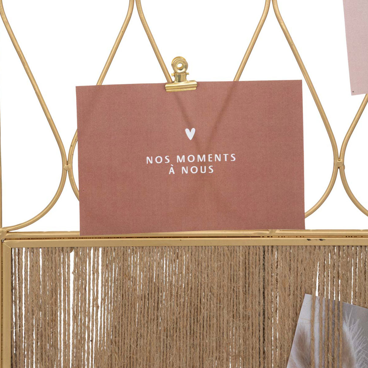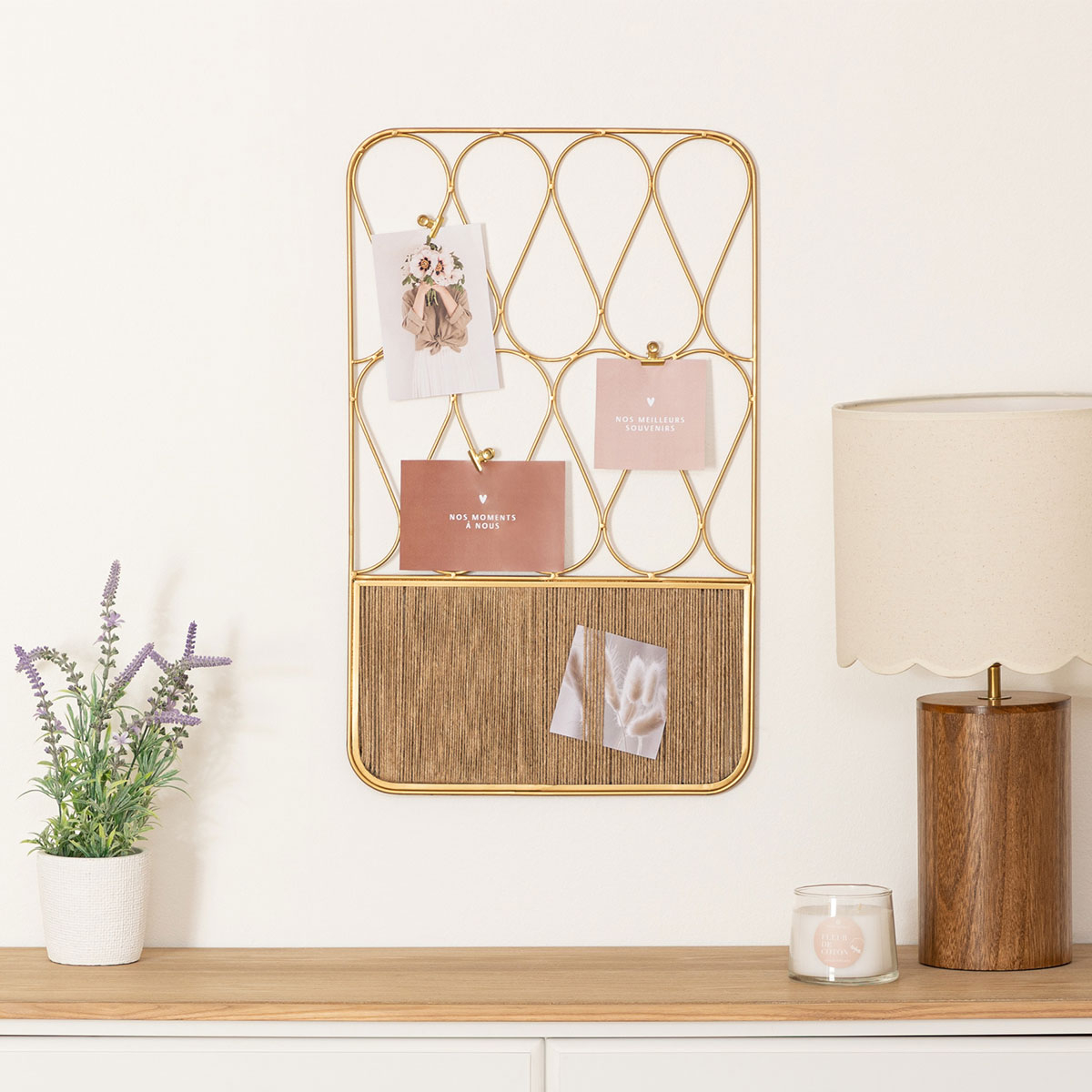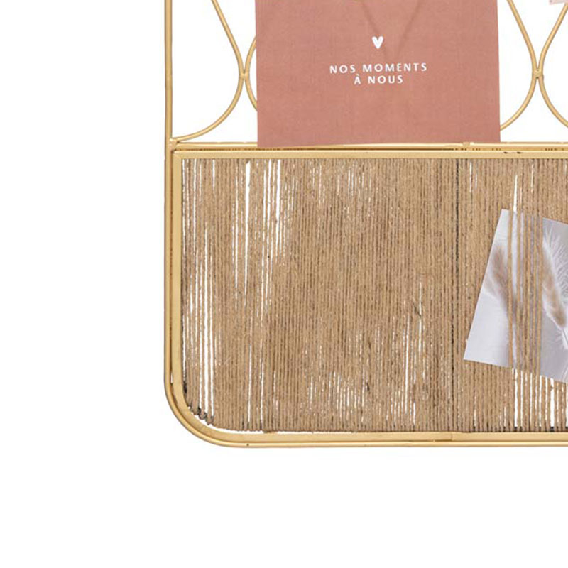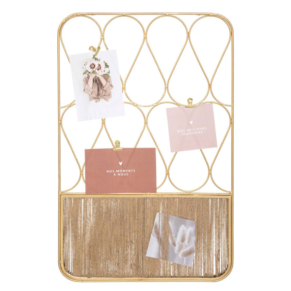 Διακοσμητικό τοίχου με χώρο για να κρεμάσετε τις φωτογραφίες ή τις σημειώσεις σας. Είναι κατασκευασμένο από μεταλλικό υλικό σε χρυσό χρώμα με μπεζ λεπτομέρειες από jute. Τοποθετήστε το σε έναν κενό τοίχο του σπιτιού σας για να δώσετε μια μοντέρνα πινελιά στον χώρο σας.