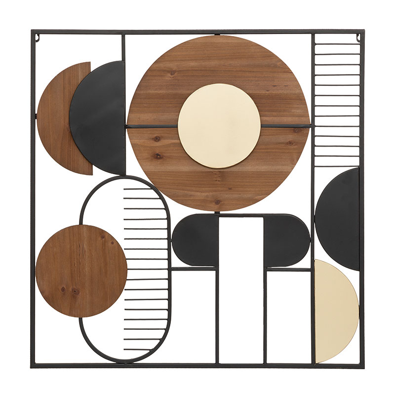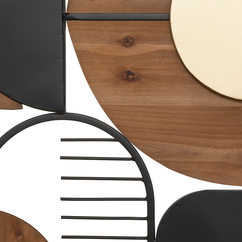 Διακοσμητικό τοίχου με μοντέρνο σχεδιασμό. Είναι κατασκευασμένο από μεταλλικό υλικό σε μαύρο χρώμα και έχει ξύλινες λεπτομέρειες από MDF και μοριοσανίδα σε μπεζ-καφέ-μαύρο χρώμα. Τοποθετήστε το σε έναν κενό τοίχο για να δώσετε χαρακτήρα και να διακοσμήσετε μοναδικά τον χώρο σας.