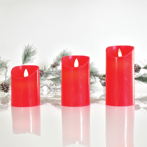 Διακοσμητικό κερί με Led και κινούμενη φλόγα από την εταιρεία Eurolamp. Είναι κατασκευασμένο από κερί σε κόκκινο χρώμα. Διαθέτει 1 ενσωματωμένη πλακέτα Led 0.15W, θερμού λευκού φωτισμού που προσομοιάζει το φως κεριού. Έχει βαθμό στεγανότητας IP20 που το καθιστά κατάλληλο για εσωτερικούς χώρους. Διαθέτει χρονοδιακόπτη και λειτουργεί με 3ΑΑΑ μπαταρίες (δεν συμπεριλαμβάνονται).