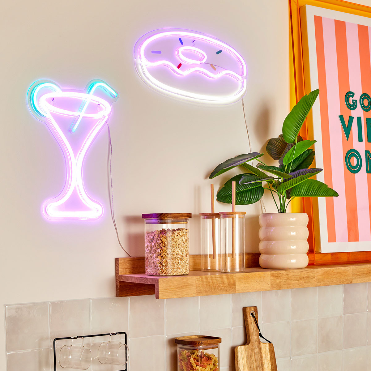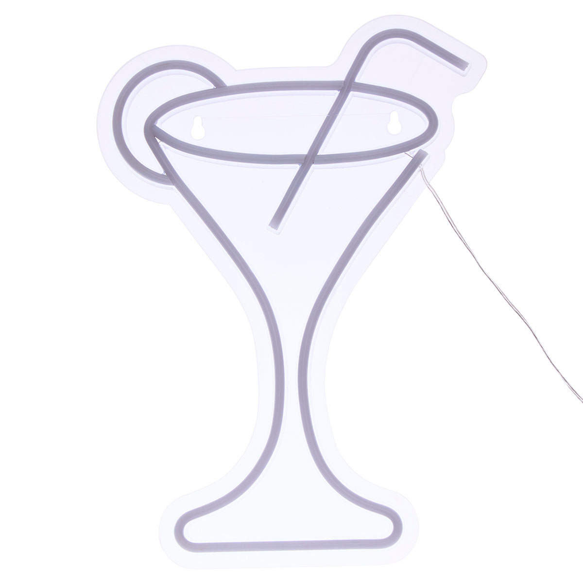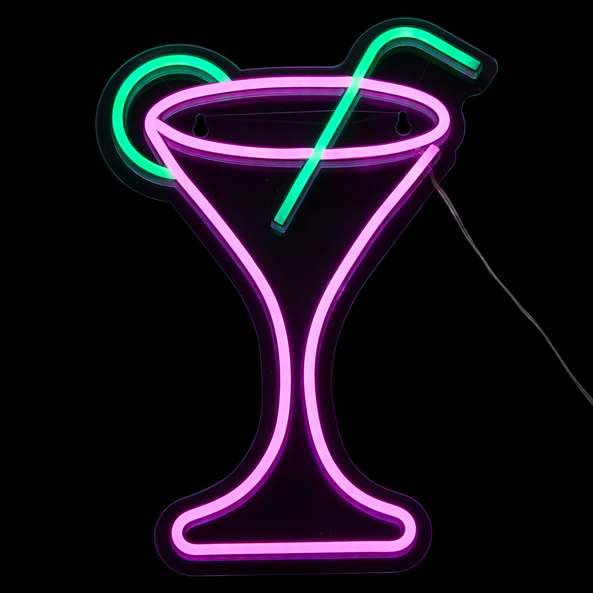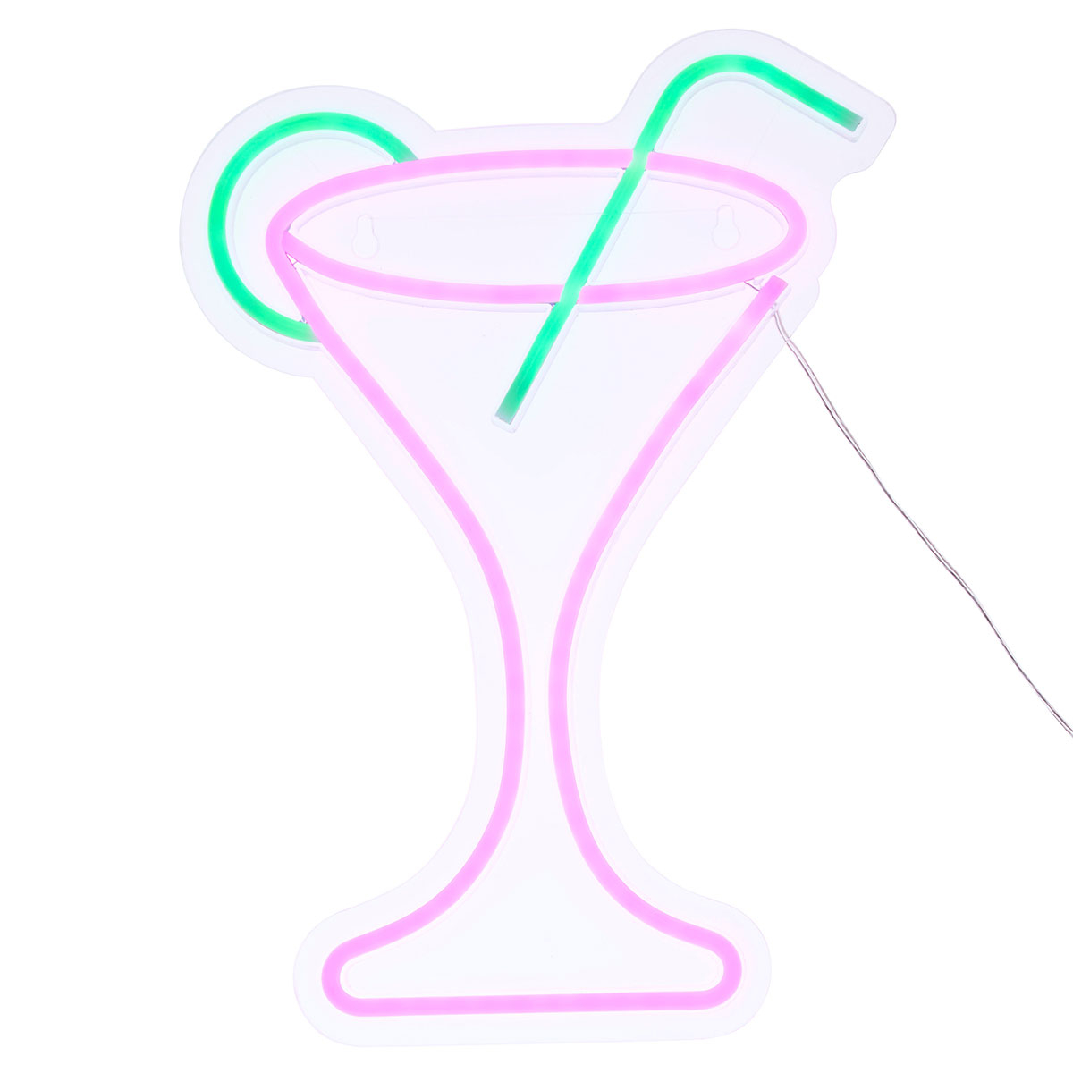 Επιτοίχιο διακοσμητικό Neon Led φωτιστικό σε σχήμα κοκτέιλ. Είναι κατασκευασμένο από πλαστικό υλικό και σιλικόνη και φωτίζει σε ροζ και τυρκουάζ χρωματισμό. Διαθέτει καλώδιο USB 200εκ. με διακόπτη On/Off. Ιδανικό για να δώσει παιχνιδιάρικο ύφος σε όλους τους χώρους του σπιτιού.