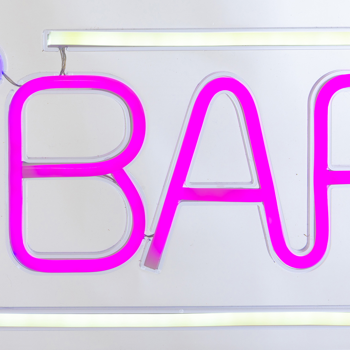 Επιτοίχιο διακοσμητικό Neon Led φωτιστικό με τη φράση Bar. Είναι κατασκευασμένο από πλαστικό υλικό και σιλικόνη και φωτίζει σε ροζ, μπλε και κίτρινο χρωματισμό. Έχει διακόπτη On/Off και λειτουργεί με καλώδιο USB, το οποίο συμπεριλαμβάνεται. Ιδανικό για να στολίσει όλους τους χώρους του σπιτιού.