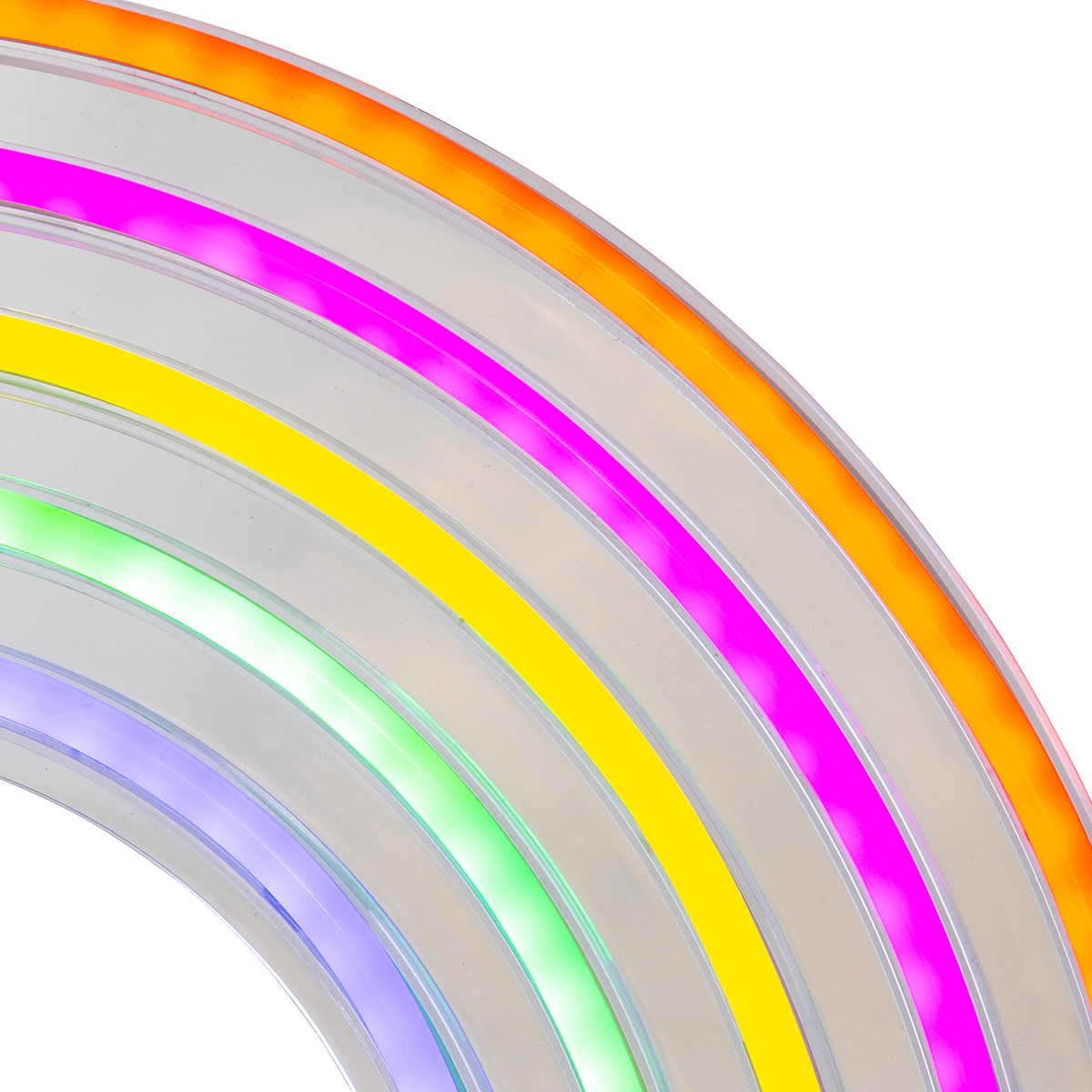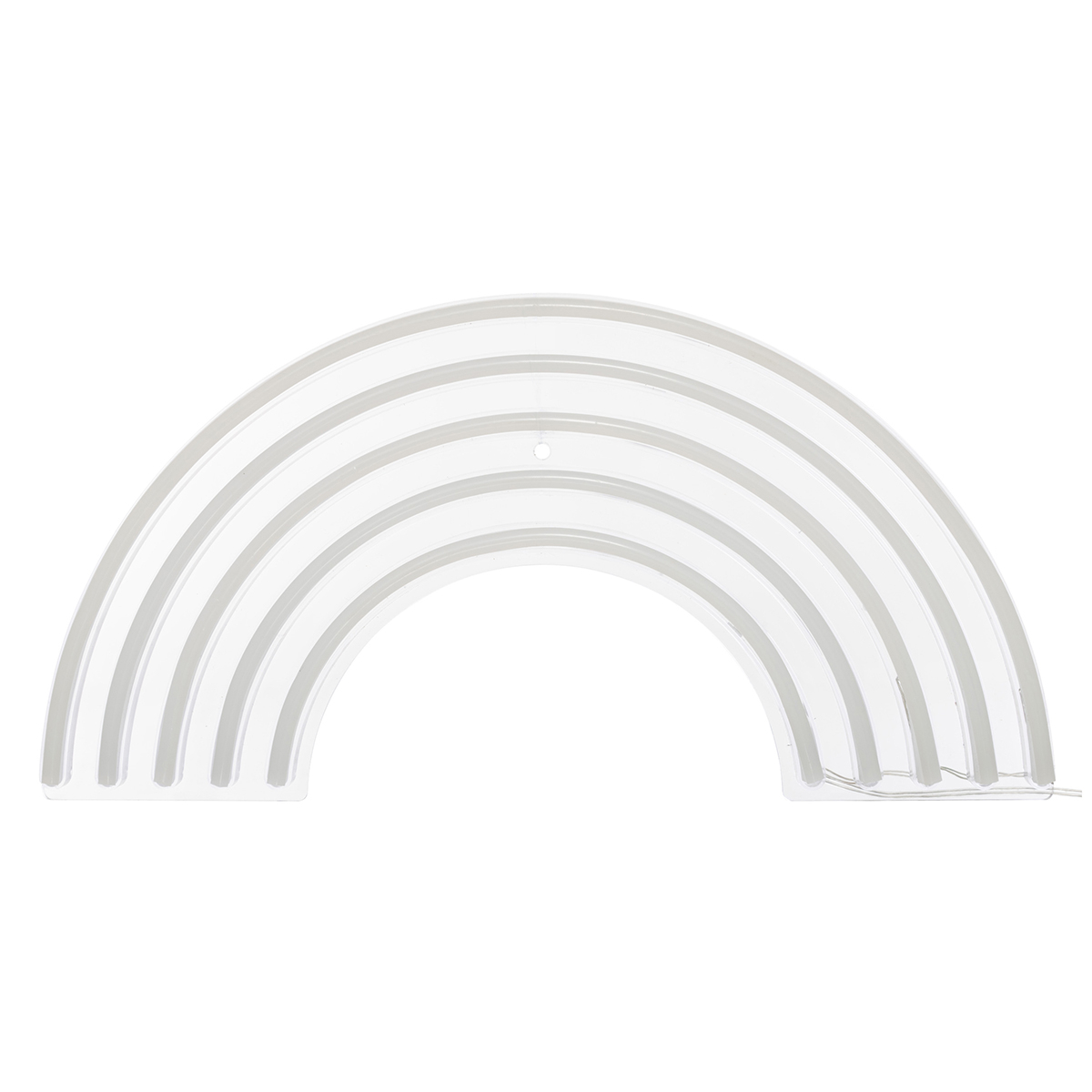 Επιτοίχιο διακοσμητικό Neon Led φωτιστικό σε σχήμα ουράνιου τόξου. Είναι κατασκευασμένο από πλαστικό υλικό και σιλικόνη και έχει πολύχρωμο φωτισμό. Διαθέτει διακόπτη On/Off και λειτουργεί με καλώδιο USB, το οποίο συμπεριλαμβάνεται. Ιδανικό για να στολίσει όλους τους χώρους του σπιτιού.