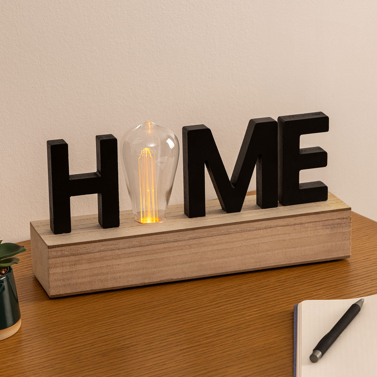 Διακοσμητικό φωτιστικό με Led φωτάκι. Ο σκελετός είναι από MDF_E1 υλικό με επιγραφή HOME. Λειτουργεί με 3 μπαταρίες ΑAA/LR03, οι οποίες δεν περιλαμβάνονται. Ιδανικό επιτραπέζιο φωτιστικό για να διακοσμήσει το χώρο σας.