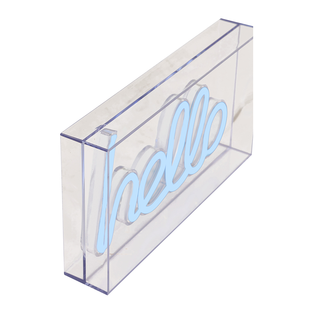 Επιτραπέζιο διακοσμητικό Neon Led φωτιστικό με τη φράση Hello. Είναι κατασκευασμένο από πλαστικό υλικό και σιλικόνη και έχει γαλάζιο φωτισμό. Διαθέτει διακόπτη On/Off και λειτουργεί με καλώδιο USB, το οποίο συμπεριλαμβάνεται. Ιδανικό για να στολίσει όλους τους χώρους του σπιτιού.