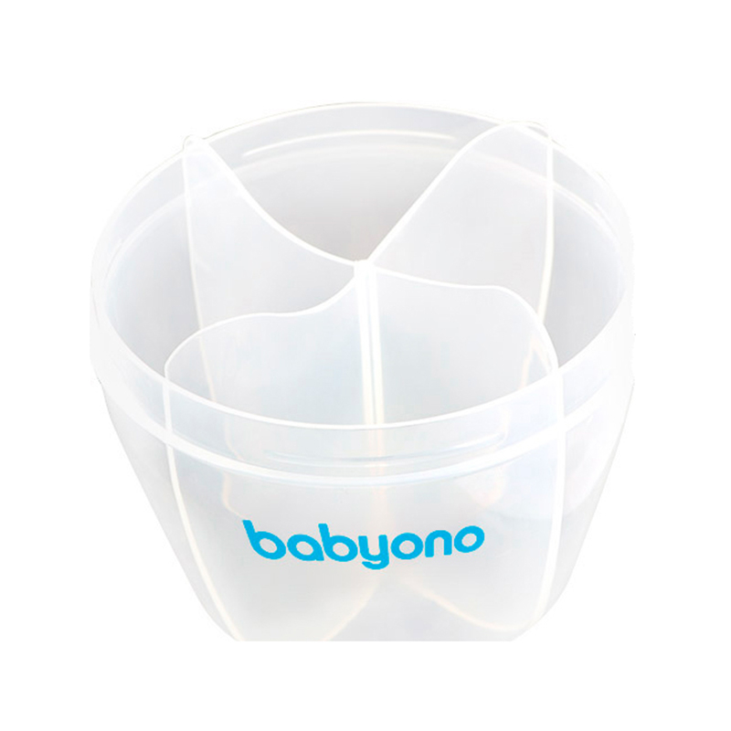 Δοσομετρητής σκόνης γάλακτος της εταιρείας BabyOno. Ειδικά σχεδιασμένος για να αποθηκεύετε την ακριβή ποσότητα. Μικρό, ελαφρύ και εύχρηστο, είναι ιδανικό για τις βόλτες και τα ταξίδια σας. Διαθέτει 4 θέσεις που κάθε μία χωράει 4 κουταλιές σκόνης γάλακτος. Το καπάκι κλείνει γερά και περιστρέφεται για να ρίξετε σκόνη γάλακτος από την θέση που επιθυμείτε μέσα στο μπιμπερό. Είναι κατασκευασμένος από πλαστικό υλικό υψηλής ποιότητας χωρίς BPA. Πλύνετε με ζεστό νερό και σαπούνι πριν την πρώτη χρήση.