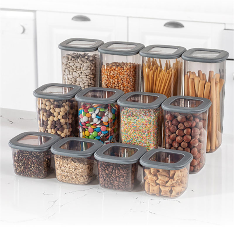 Δοχεία αποθήκευσης τροφίμων με καπάκι σετ 12 τεμαχίων σε 3 διαστάσεις. Είναι γκρι, κατασκευασμένα από πλαστικό απαλλαγμένο από BPA. Ιδανικά για να αποθηκεύσετε ζυμαρικά, όσπρια, ξηρούς καρπούς ή ότι άλλο θέλετε να οργανώσετε.