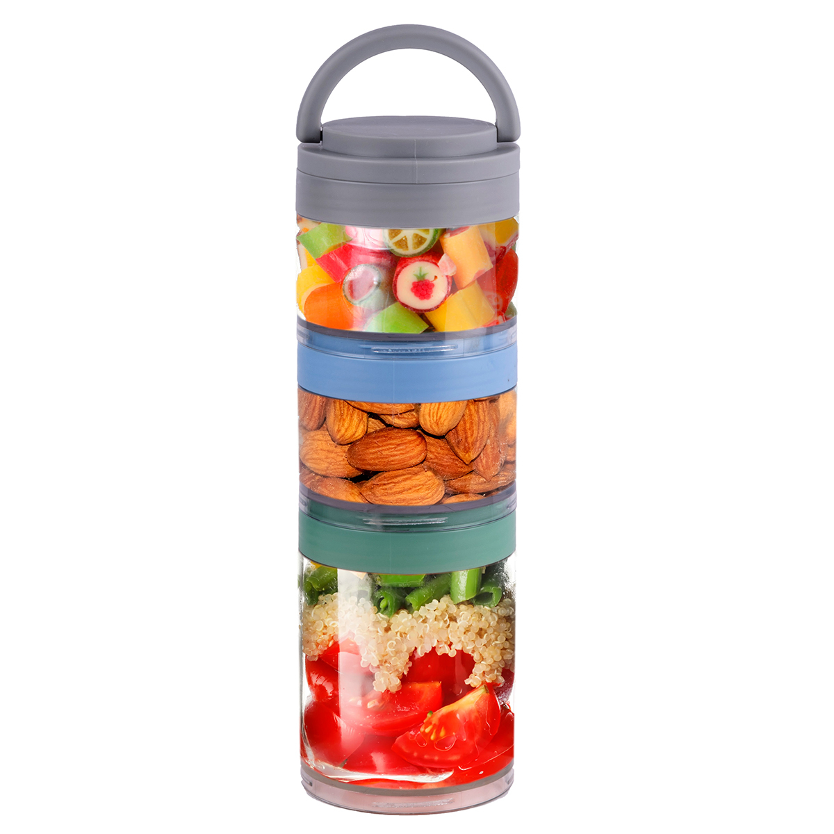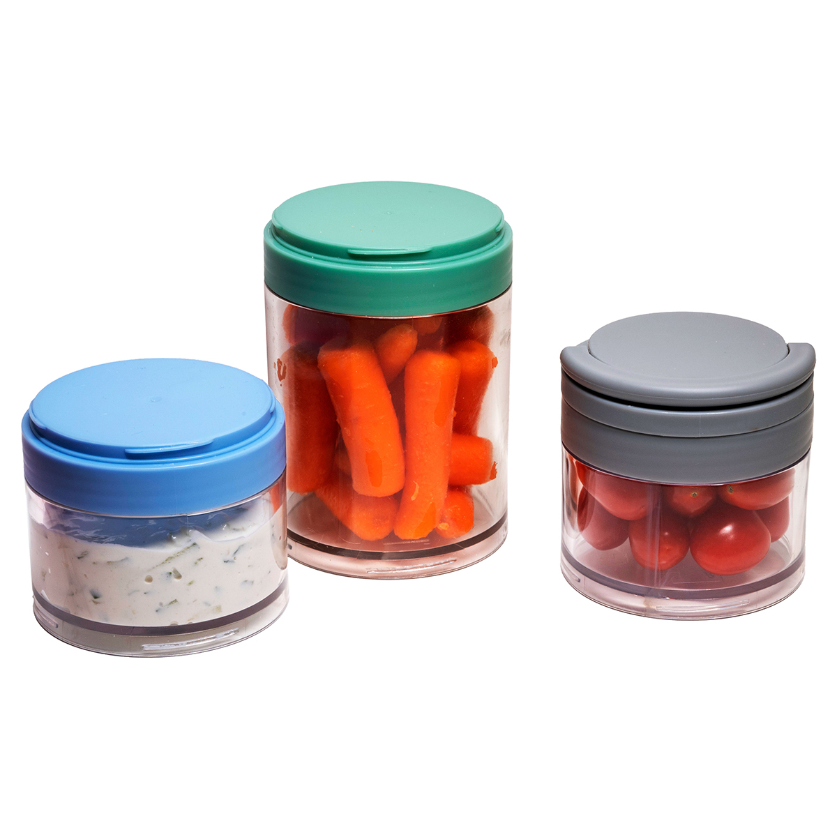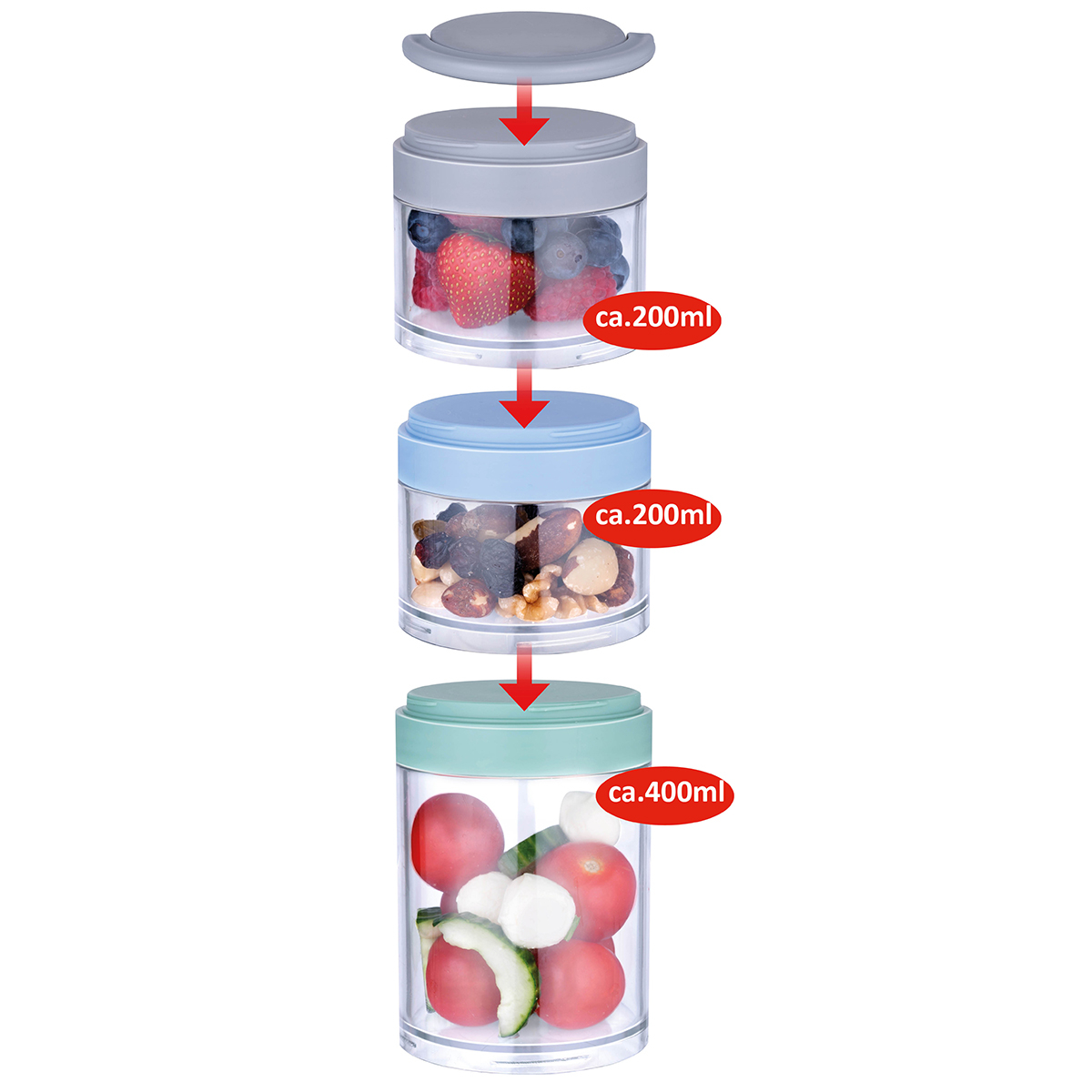 Στοιβαζόμενα δοχεία για τρόφιμα σε σετ από την εταιρεία Alpina. Το σετ περιλαμβάνει 2 δοχεία χωρητικότητας 200ml και 1 δοχείο χωρητικότητας 400ml. Είναι κατασκευασμένα από διάφανο πλαστικό υλικό που σας επιτρέπει να βλέπετε το περιεχόμενο του δοχείου και έχουν πολύχρωμα καπάκια. Τοποθετούνται και σφραγίζουν το ένα πάνω στο άλλο και διαθέτουν λαβή για εύκολη μεταφορά. Ιδανικά για να αποθηκεύσετε ξηρούς καρπούς, ζαχαρωτά ή ό,τι άλλο θέλετε.