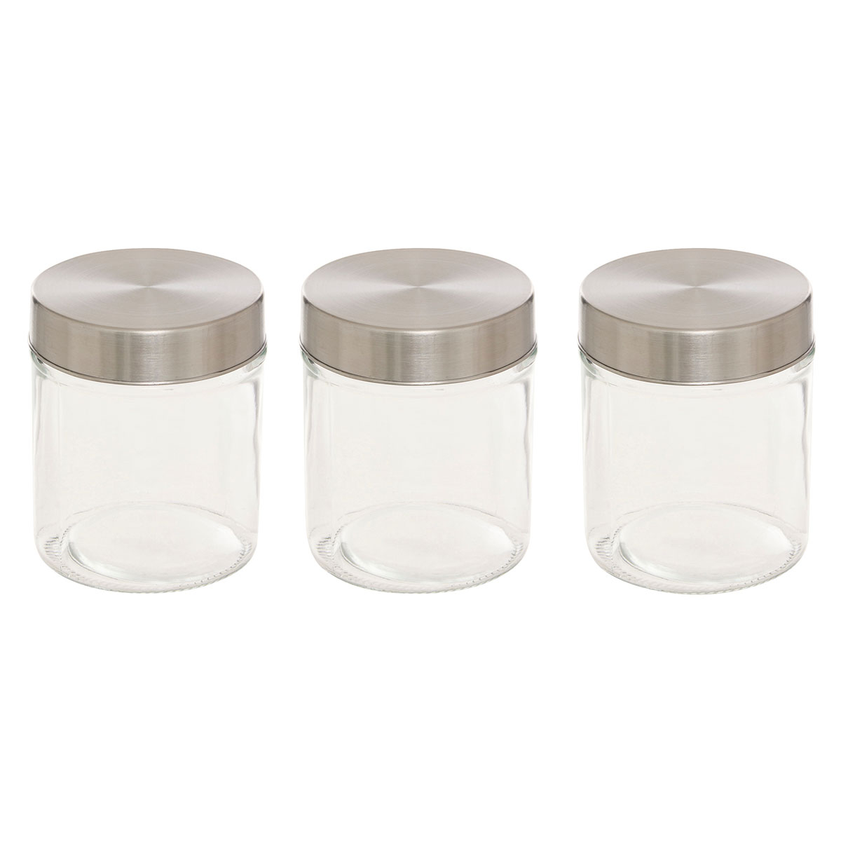Βάζα για την κουζίνα με καπάκι, σε σετ. Το σετ αποτελείται από 3 δοχεία ίδιων διαστάσεων και xωρητικότητας 700ml . Είναι κατασκευασμένα από διάφανο γυαλί και έχουν ασημί καπάκι από μεταλλικό υλικό. Μπορείτε να τοποθετήσετε μέσα ζάχαρη, καφέ, τσάι ή ότι άλλο θέλετε. Συνδυάστε τα με τα υπόλοιπα είδη της ίδιας σειράς για ένα ολοκληρωμένο αποτέλεσμα.