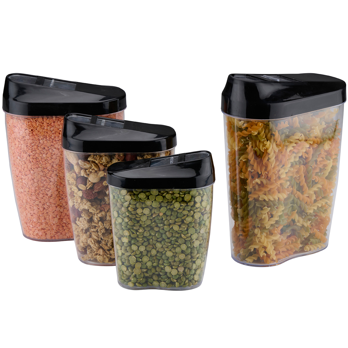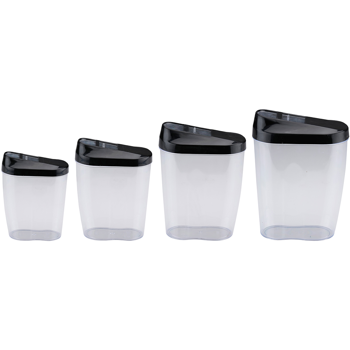 Δοχεία για τρόφιμα σε σετ από την εταιρεία Alpina. Το σετ περιλαμβάνει 1 δοχείο χωρητικότητας 450ml, 1 δοχείο χωρητικότητας 600ml, 1 δοχείο χωρητικότητας 850ml και 1 δοχείο χωρητικότητας 1250ml. Είναι κατασκευασμένα από διάφανο πλαστικό υλικό που σας επιτρέπει να βλέπετε το περιεχόμενο του δοχείου και έχουν μαύρο καπάκι. Τα καπάκια διαθέτουν τρύπα που σας επιτρέπει να ρίξετε το περιεχόμενο χωρίς να ανοίξετε τελείως το καπάκι. Ιδανικά για να αποθηκεύσετε ζυμαρικά, όσπρια, ξηρούς καρπούς ή ό,τι άλλο θέλετε.