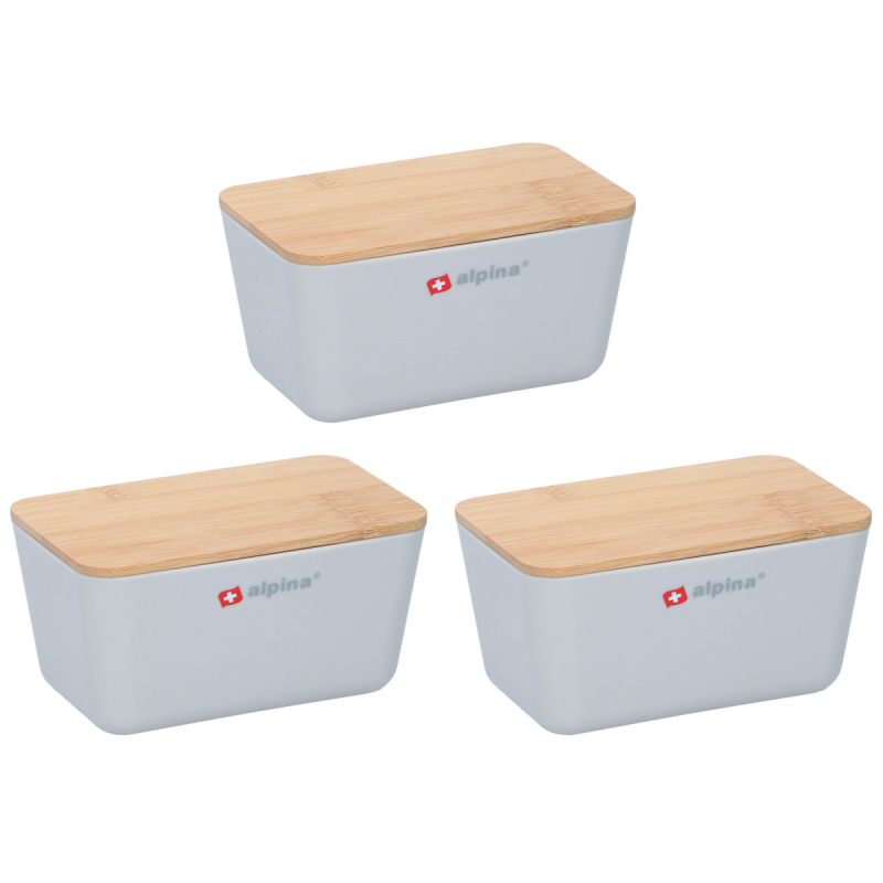 Δοχεία τροφίμων με καπάκι, από την εταιρεία Alpina. Το σετ περιλαμβάνει 3 φαγητοδοχεία ίδιου μεγέθους. Είναι κατασκευασμένα από πλαστικό υλικό σε λευκό χρώμα με μπεζ καπάκι από ξύλο bamboo. Μπορείτε να τοποθετήσετε μέσα ρύζι, δημητριακά, όσπρια ή ότι άλλο επιθυμείτε. Χωρητικότητα: 0.5lt.