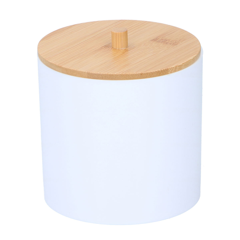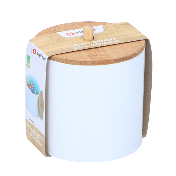 Δοχείο αποθήκευσης ιδανικό για μικροπράγματα από την εταιρεία Alpina. Είναι κατασκευασμένο από λευκό πλαστικό υλικό και ξύλο bamboo σε μπεζ χρώμα. Διαθέτει λαβή, για να μπορείτε να τα ανοίγετε. Μπορείτε να το χρησιμοποιήσετε σαν αποθηκευτικό χώρο για να φυλάξετε κοκαλάκια, τσιμπιδάκια, κραγιόν, μπατονέτες ή ό,τι άλλο θέλετε αλλά και σαν μπιζουτιέρα για να κρατήσετε τακτοποιημένα τα κοσμήματά σας χωρίς χτυπήματα ή γρατζουνιές. Συνδυάστε το με τα υπόλοιπα αξεσουάρ της ίδιας σειράς για να οργανώσετε το μπάνιο σας.