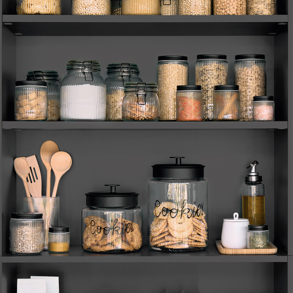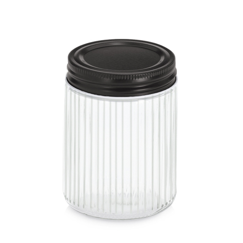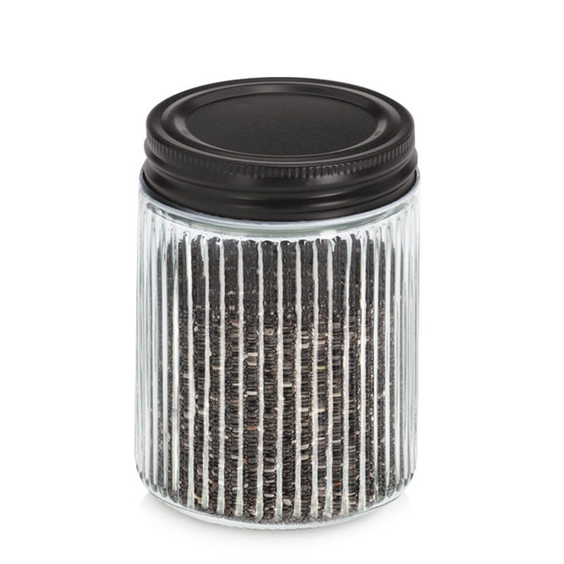 Βάζο για την κουζίνα κατασκευασμένο από διάφανο ανάγλυφο γυαλί με βιδωτό μεταλλικό καπάκι σε μαύρο χρώμα. Κλείνει αεροστεγώς και είναι ιδανικό για να παραμένει φρέσκο το περιεχόμενο του. Χωρητικότητα: 300ml. Συνδυάστε το με τα υπόλοιπα είδη της ίδιας συλλογής για ένα ολοκληρωμένο αποτέλεσμα στη κουζίνα σας.