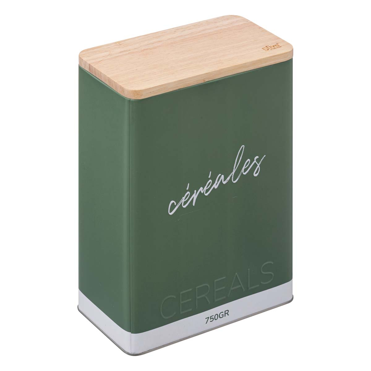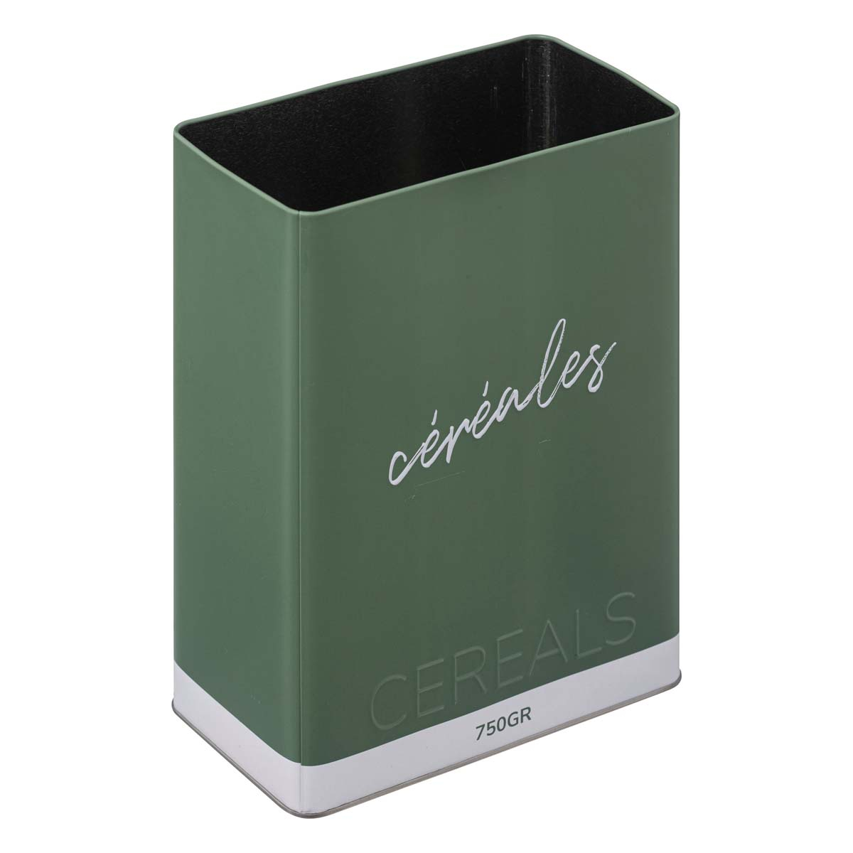 Δοχείο για δημητριακά σε πράσινη απόχρωση. Κατασκευασμένο από μεταλλικό υλικό με ξύλινο καπάκι. Μπορεί να χωρέσει μέχρι 750 gr δημητριακά.