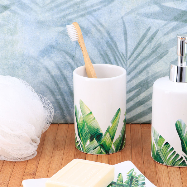 Δοχείο κρεμοσάπουνου κατασκευασμένο από κεραμικό υλικό σε λευκό χρώμα με πράσινο tropical σχέδιο. Ιδανικό ντισπένσερ που θα ταιριάξει με όλα τα είδη διακόσμησης στο μπάνιο σας. Χωρητικότητα 320ml. Συνδυάστε το με τα υπόλοιπα είδη της ίδιας σειράς για ένα ολοκληρωμένο αποτέλεσμα στο μπάνιο σας.