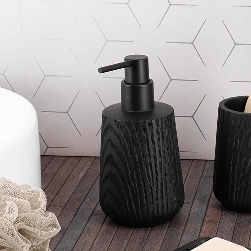 Δοχείο κρεμοσάπουνου με μοντέρνο σχεδιασμό. Είναι κατασκευασμένο από κεραμικό υλικό σε μαύρο χρώμα με εφέ ξύλου. Ιδανικό να ταιριάξει σε κάθε μπάνιο. Συνδυάστε το με τα υπόλοιπα προϊόντα του ίδιου σετ για ένα ολοκληρωμένο αποτέλεσμα. Χωρητικότητα: 350ml.