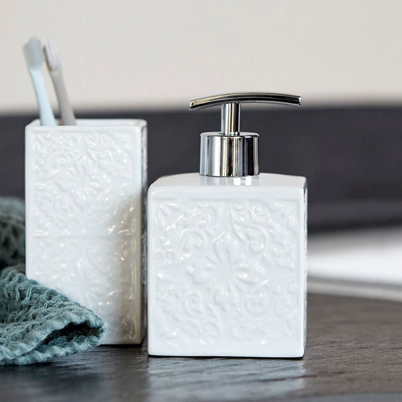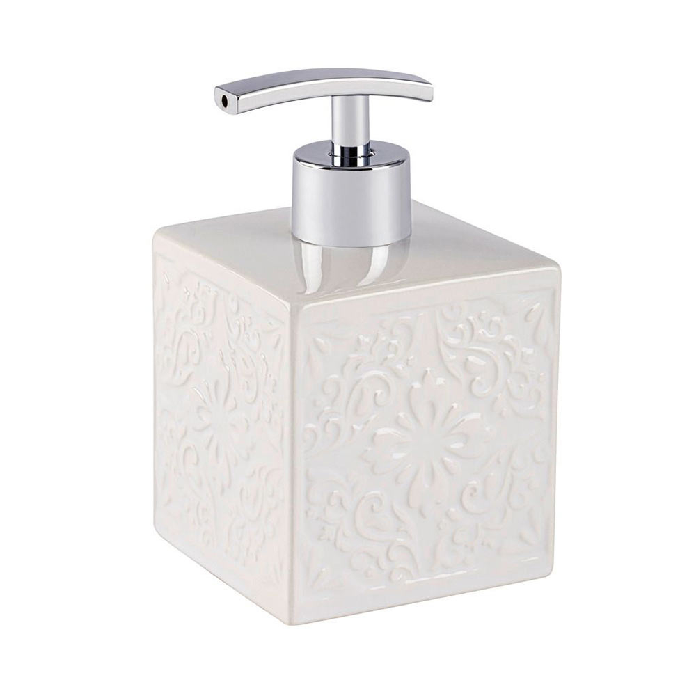 Δοχείο κρεμοσάπουνου από την γερμανική εταιρεία Wenko. Είναι κατασκευασμένο από κεραμικό υλικό σε εκρού χρώμα με ανάγλυφοo έθνικ σχέδιο. Συνδυάστε το με τα υπόλοιπα αξεσουάρ του ίδιου σετ για ένα ολοκληρωμένο αποτέλεσμα.
