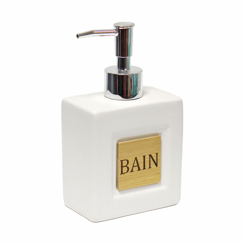 Δοχείο κρεμοσάπουνου σε λευκό χρώμα με μοντέρνο σχεδιασμό. Είναι κατασκευασμένο από κεραμικό υλικό με μπεζ bamboo λεπτομέρεια. Συνδυάστε το με τα υπόλοιπα προϊόντα της σειράς για ολοκληρωμένο αποτέλεσμα.