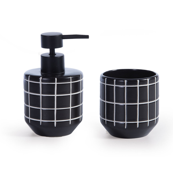 Δοχείο κρεμοσάπουνου από την εταιρεία Nef-Nef με μαύρο καρό σχέδιο. Είναι κατασκευασμένο από κεραμικό υλικό με μεταλλική αντλία σε μαύρο χρώμα. Ταιριάξτε το με τα υπόλοιπα είδη της ίδιας σειράς για μία αρμονική διακόσμηση του μπάνιου σας.