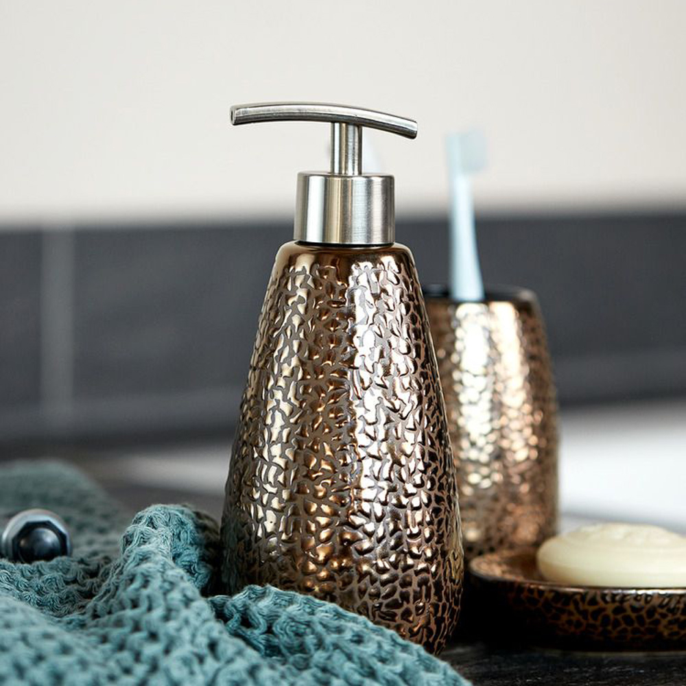 Δοχείο κρεμοσάπουνου από την γερμανική εταιρεία Wenko με μοντέρνο ανάγλυφο σχέδιο. Είναι κατασκευασμένο από υψηλής ποιότητα κεραμικό με μπρονζέ απόχρωση. Χωρητικότητα: 400ml. Συνδυάστε το με τα υπόλοιπα αξεσουάρ του ίδιου σετ για ένα ολοκληρωμένο αποτέλεσμα.