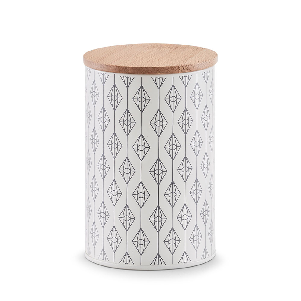 Στρογγυλό δοχείο τροφίμων για την κουζίνα σας με μοντέρνο σχέδιο. Είναι κατασκευασμένο από μεταλλικό υλικό, κατάλληλο για επαφή με τρόφιμα, σε λευκό χρώμα με γκρι λεπτομέρειες. Έχει καπάκι από ξύλο bamboo σε μπεζ χρώμα που κλείνει αεροστεγώς, καθώς διαθέτει δακτύλιο σιλικόνης, για να παραμένουν τα τρόφιμα φρέσκα. Ιδανικό για να αποθηκεύσετε τα τρόφιμά σας και να διατηρήσετε οργανωμένη την κουζίνα και τα ντουλάπια σας. Χωρητικότητα 1000ml. Συνδυάστε το με τα υπόλοιπα είδη της ίδιας συλλογής για ένα ολοκληρωμένο αποτέλεσμα στο χώρο σας.