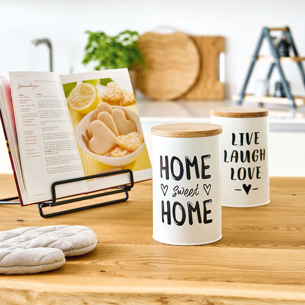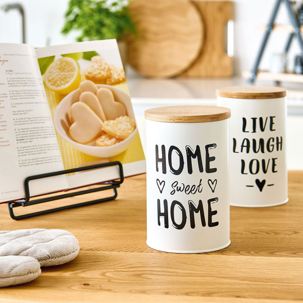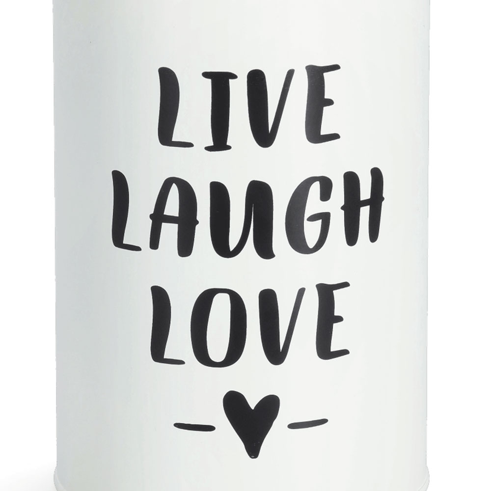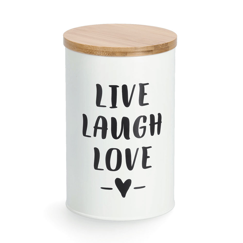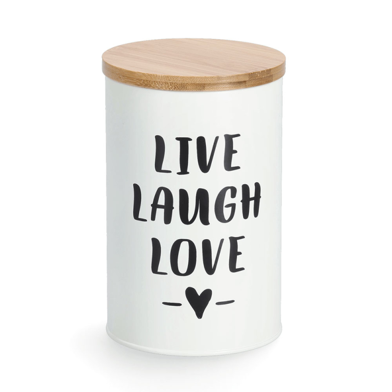 Στρογγυλό δοχείο τροφίμων για την κουζίνα σας με μοντέρνο σχέδιο. Είναι κατασκευασμένο από μεταλλικό υλικό, κατάλληλο για επαφή με τρόφιμα, σε λευκό χρώμα με μαύρο σχέδιο. Έχει καπάκι από ξύλο bamboo κατασκευασμένο από βιώσιμα υλικά (μπαμπού πιστοποιημένο από FSC). Ιδανικό για να αποθηκεύσετε τα τρόφιμά σας και να διατηρήσετε οργανωμένη την κουζίνα και τα ντουλάπια σας. Χωρητικότητα 1000ml. Συνδυάστε το με τα υπόλοιπα είδη της ίδιας συλλογής για ένα ολοκληρωμένο αποτέλεσμα στο χώρο σας. Με πιστοποίηση FSC 100% SCS-COC-000256.