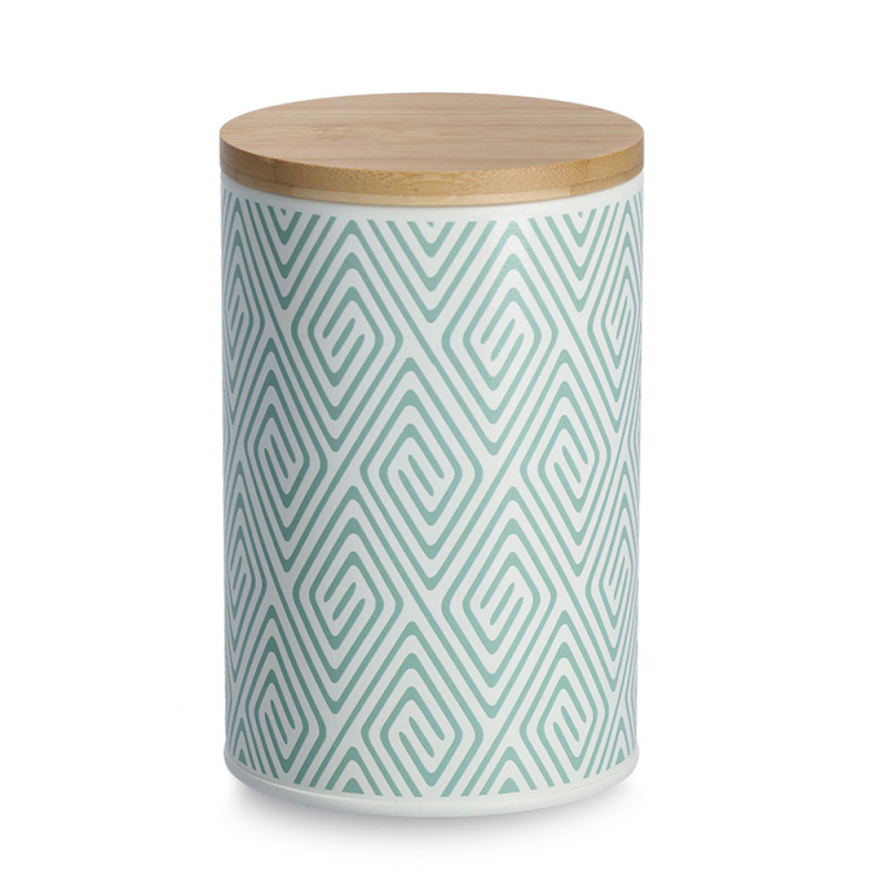 Στρογγυλό δοχείο τροφίμων για την κουζίνα σας με μοντέρνο σχέδιο. Είναι κατασκευασμένο από μεταλλικό υλικό, κατάλληλο για επαφή με τρόφιμα, σε λευκό χρώμα με βεραμάν λεπτομέρειες. Έχει καπάκι από ξύλο bamboo σε μπεζ χρώμα. Ιδανικό για να αποθηκεύσετε τα τρόφιμά σας και να διατηρήσετε οργανωμένη την κουζίνα και τα ντουλάπια σας. Χωρητικότητα 1000ml. Συνδυάστε το με τα υπόλοιπα είδη της ίδιας συλλογής για ένα ολοκληρωμένο αποτέλεσμα στο χώρο σας.