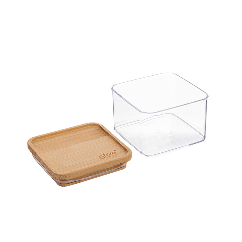 Τετράγωνο διάφανο δοχείο τροφίμων για την κουζίνα σας. Είναι κατασκευασμένο από πλαστικό υλικό Polystyrene, κατάλληλο για επαφή με τρόφιμα. Έχει καπάκι από ξύλο bamboo σε μπεζ χρώμα που κλείνει αεροστεγώς, καθώς διαθέτει δακτύλιο σιλικόνης, για να παραμένουν τα τρόφιμα φρέσκα. Το τετράγωνο σχήμα του το καθιστά ιδιαίτερο πρακτικό και με εύκολη αποθήκευση. Ιδανικό για να αποθηκεύσετε τα τρόφιμά σας και να διατηρήσετε οργανωμένη την κουζίνα και τα ντουλάπια σας. Χωρητικότητα 500ml.