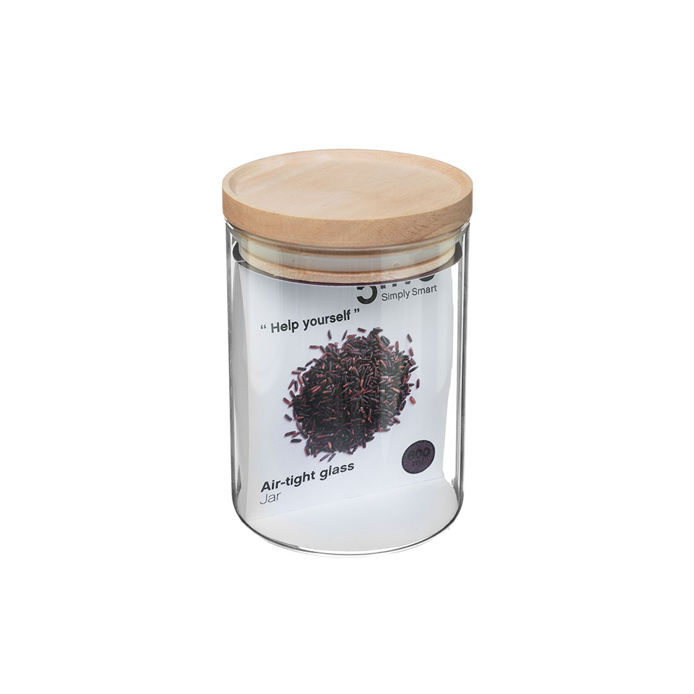 Διάφανο δοχείο τροφίμων για την κουζίνα σας. Είναι κατασκευασμένο από γυαλί, κατάλληλο για επαφή με τρόφιμα και έχει ξύλινο καπάκι σε μπεζ χρώμα για αεροστεγές κλείσιμο. Χωρητικότητα 600ml. Συνδυάστε το με τα υπόλοιπα προϊόντα του ίδιου σετ για ένα ολοκληρωμένο αποτέλεσμα.