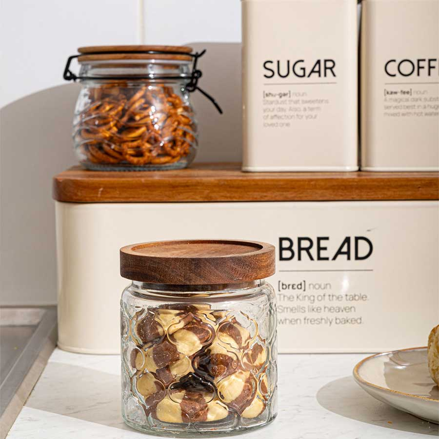 Δοχείο για τρόφιμα χωρητικότητας 700ml από την εταιρεία εstia με ανάγλυφο σχέδιο. Είναι κατασκευασμένο από διάφανο γυαλί. Σας επιτρέπει να βλέπετε το περιεχόμενο του δοχείου. Το καπάκι κλείνει αεροστεγώς και είναι κατασκευασμένο από ξύλο ακακίας. Ιδανικό για να αποθηκεύσετε ζυμαρικά, όσπρια, ξηρούς καρπούς ακόμα και υγρά αφού το αεροστεγές κλείσιμο δεν επιτρέπει να τρέξει καθόλου υγρό. Συνδυάστε το με τα υπόλοιπα μεγέθη της σειράς για ένα ολοκληρωμένο αποτέλεσμα.